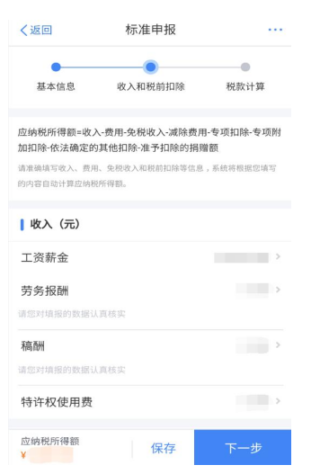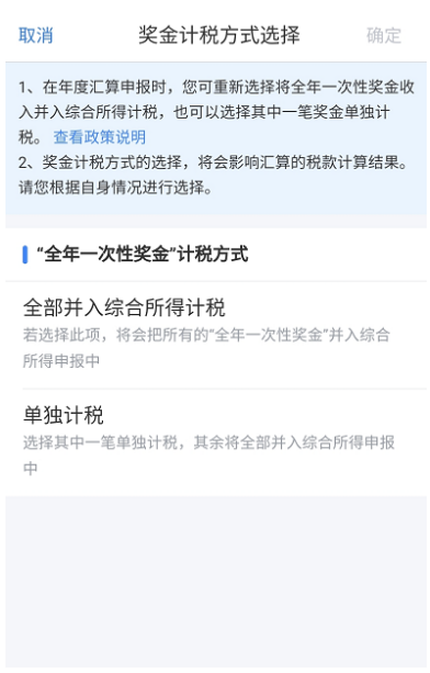 第四步:在收入和税前扣除界面,点击“工资薪金”-“奖金计税方式选择”,在 “全年一次性奖金”处,计税方式可选择“单独计税”或“全部并入综合所得”,两者均为合规选项。再返回至收入和税前扣除界面,继续确认各项收入及扣除金额,确认无误后点击“下一步”。