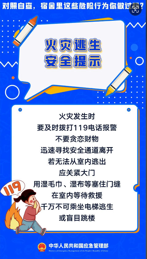 暑假假期正式结束,新学期开学啦。开学第一课,先学安全课,学校作为人员密集场所消防安全尤为重要,宿舍可燃物多且用电量大,一旦发生火灾后果不堪设想,用电饭煲做饭、使用劣质充电宝………对照自查宿舍里这些危险行为你做过吗?