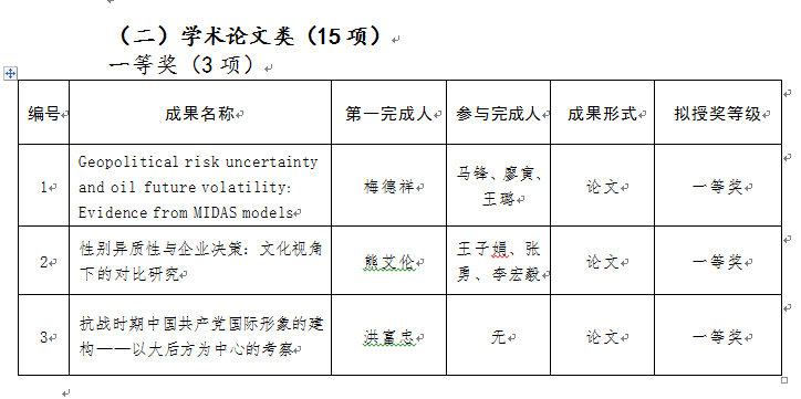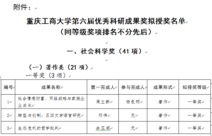 按照《华体会体育·(sports)官方网站科学研究奖实施办法》和《关于组织申报华体会体育·(sports)官方网站第六届优秀科研成果奖的通知》,参照国家科学技术奖、重庆市科学技术奖及重庆市社科优秀成果奖的评价指标体系,本着创新导向,质量优先,宁缺毋滥的原则,科研处组织校外专家成立若干学科评审组对申报成果进行评审。专家按照评分细则对申报成果进行了独立评审和投票表决。综合专家评审意见和授奖建议,形成了华体会体育·(sports)官方网站第六届优秀科研成果拟授奖名单,拟授奖成果共计49项。现将《华体会体育·(sports)官方网站第六届优秀科研成果奖拟授奖名单》予以公示。