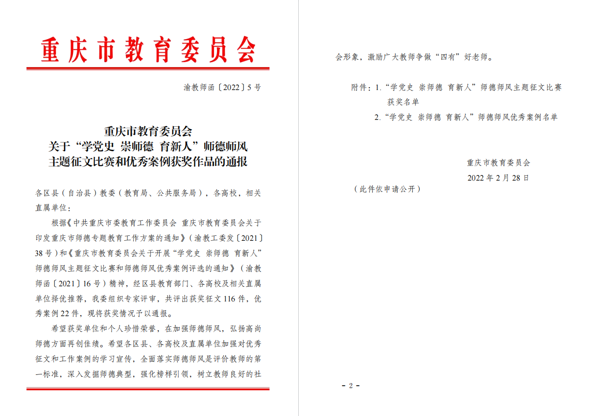 为深入学习贯彻习近平总书记关于教育的重要论述和“七一”重要讲话精神,市教委组织开展了2021年“学党史 崇师德 育新人”师德师风主题征文比赛和优秀师德师风案例评选,我校征文作品《履道铸师范,初心坚如磐》获一等奖、《万世师表》获二等奖、《致敬追光者——王红旭》获三等奖,案例《党建引领下的高校社会科学师德师风建设》获评优秀案例。