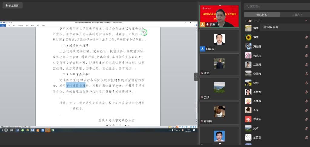 3月24日下午,全校办公室系统2022年第二次工作例会在线上召开。各单位综合办公室或综合事务工作负责人线上参加了会议。学校党政办公室主任罗勇主持会议并讲话。