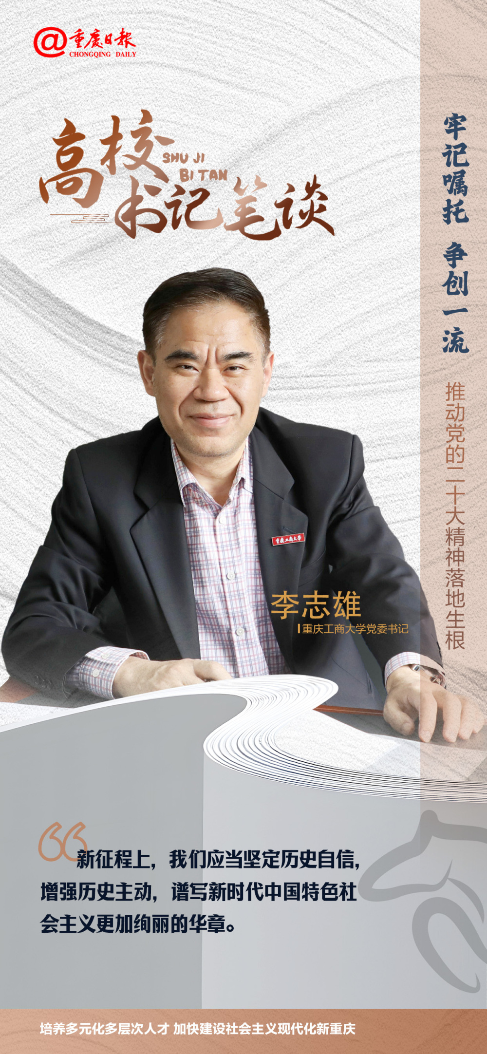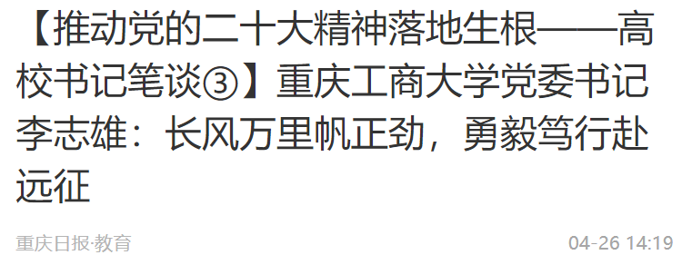 4月26日,《重庆日报》刊发我校党委书记李志雄学习党的二十大报告心得体会的署名文章:《长风万里帆正劲,勇毅笃行赴远征》。