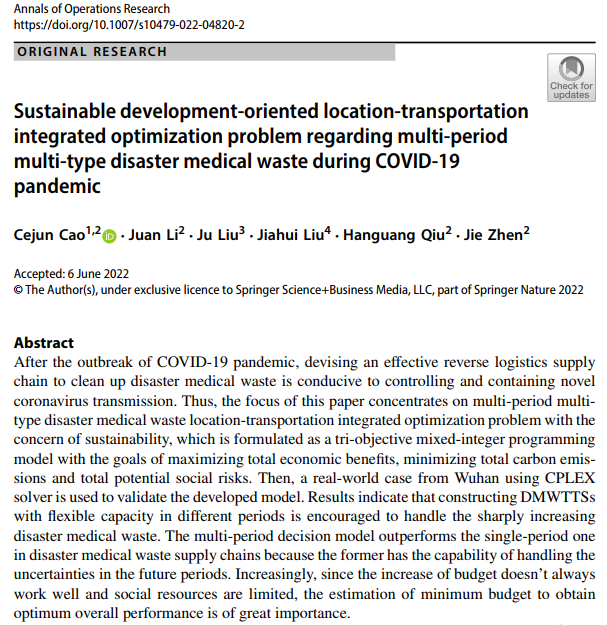 另外,曹策俊副教授指导的本科生李娟(2018级物流管理),在管理学(运筹学与管理科学)领域重要期刊《Annals of Operations Research(ANOR)》发表题为“Sustainable development-oriented location-transportation integrated optimization problem regarding multi-period multi-type disaster medical waste during COVID-19 pandemic”的论文。ANOR是英国商学院协会(the Association of Business School,简称ABS)评选的三星期刊,中国《FMS管理科学高质量期刊推荐列表》中英文B类期刊,JCR分区为2区,期刊影响因子为4.82。