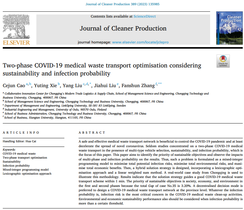 近日,我校管理科学与工程学院曹策俊副教授指导的本科生谢玉婷(2018级物流管理),在环境科学(工程:环境)领域TOP期刊《Journal of Cleaner Production(JCLP)》发表题为“Two-phase COVID-19 medical waste transport optimisation considering sustainability and infection probability”的论文。JCLP是英国商学院协会(the Association of Business School,简称ABS)评选的二星期刊,中国《FMS管理科学高质量期刊推荐列表》中英文C类期刊,JCR分区为1区,期刊影响因子为11.072。