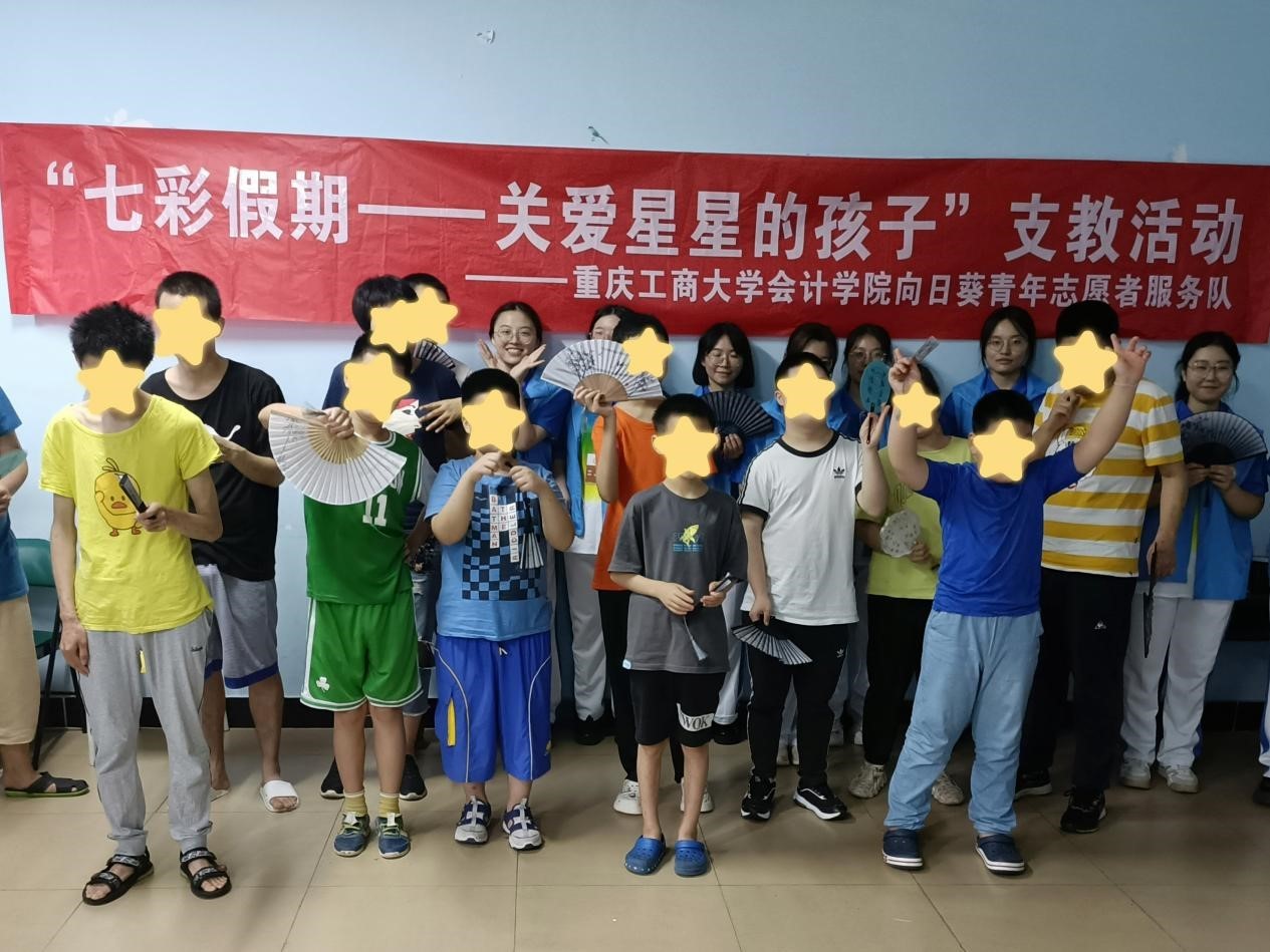 7月7日上午,会计学院向日葵青年志愿者服务队联合重庆市南岸区启明星机构青少年部开展“七彩假期——关爱星星的孩子”支教活动。在自身障碍和紧张心情的影响下,孩子们说话有些口齿不清,但经过了现场志愿者们的耐心引导和鼓励夸奖之后,他们开始积极地参与课堂、回答问题,拉近了彼此心灵上的距离。在动手实践环节,志愿者们和启明星机构的老师们一齐围在孩子们的身边进行一对一帮助,帮助手指发抖的孩子挤颜料、为反应迟缓的孩子一遍遍讲解绘画过程、为孤僻沉静的孩子蘸颜料进行演示。在绘画过程中,志愿者们通过耐心地沟通与帮助,逐渐消去开始的隔阂与陌生,与孩子们建立了融洽的关系,辅助孩子们完成了一幅幅充满童趣与想象力的绘画作品,引导孩子们感受爱与温暖。