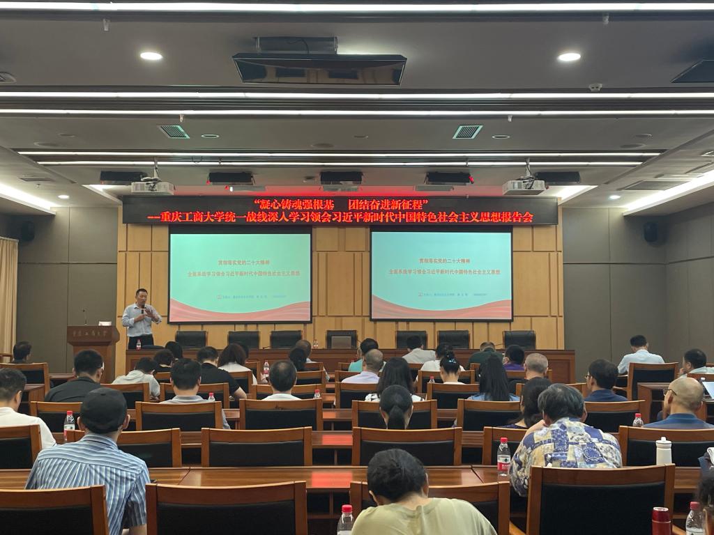 为全面贯彻落实中共二十大精神,推进校内各民主党派、无党派人士和党外知识分子持续深入开展“凝心铸魂强根基 团结奋进新征程”主题教育,学深悟透笃行习近平新时代中国特色社会主义思想,不断巩固与中国共产党团结奋斗的共同思想政治基础。9月22日下午,我校在新图书馆会议中心一会议室举行“凝心铸魂强根基 团结奋进新征程”——华体会体育·(sports)官方网站统一战线深入学习领会习近平新时代中国特色社会主义思想报告会,邀请重庆社会主义学院多党合作研究室的秦江明教授做主题报告,我校各民主党派基层组织和统战团体班子成员、成员代表共60余人参会。会议由学校党委常委、统战部常务副部长陈松主持。