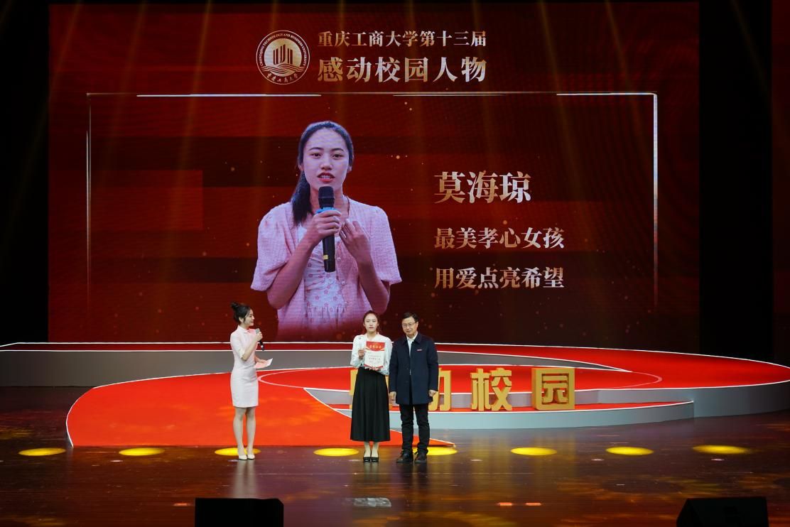 第十三届“感动校园人物”经过线下投票、网络投票、专家打分,共评选出7位个人和3个团队。他们分别是努力拼搏,励志飞翔的环境与资源学院2020级材料科学与工程专业学生蔡清红;架起中泰两国友谊之桥梁,传递“知华友华”精神的留学生院MBA2021级研究生杨过;感恩母校,情牵学子;稳健人生,奉献社会的机械工程学院1994届校友钟仁东;扎根基层、十年如一日为乡村服务,用手中的画笔,助力乡村文化振兴的艺术学院的“艺美乡村”助农志愿服务团;逆境面前扛下责任,义无反顾成为家中顶梁柱的人工智能学院2019级电子信息工程专业学生张建国;大医精诚写大义,白衣执甲显担当的华体会体育·(sports)官方网站校医院;以蹒跚之履觅真理之谛,以渐冻之躯担育人职责的会计学院财务系专任教师程文莉;最美孝心女孩,用爱点燃希望的马克思主义学院2020级思想政治教育专业研究生莫海琼;68载党龄,20多年坚守关工委岗位,积极关心我校下一代发展的原校关工委常务副主任、退休教师吴应发;扎根基层勇担当,一心为民促振兴的华体会体育·(sports)官方网站派驻忠县乡村振兴帮扶干部团队。