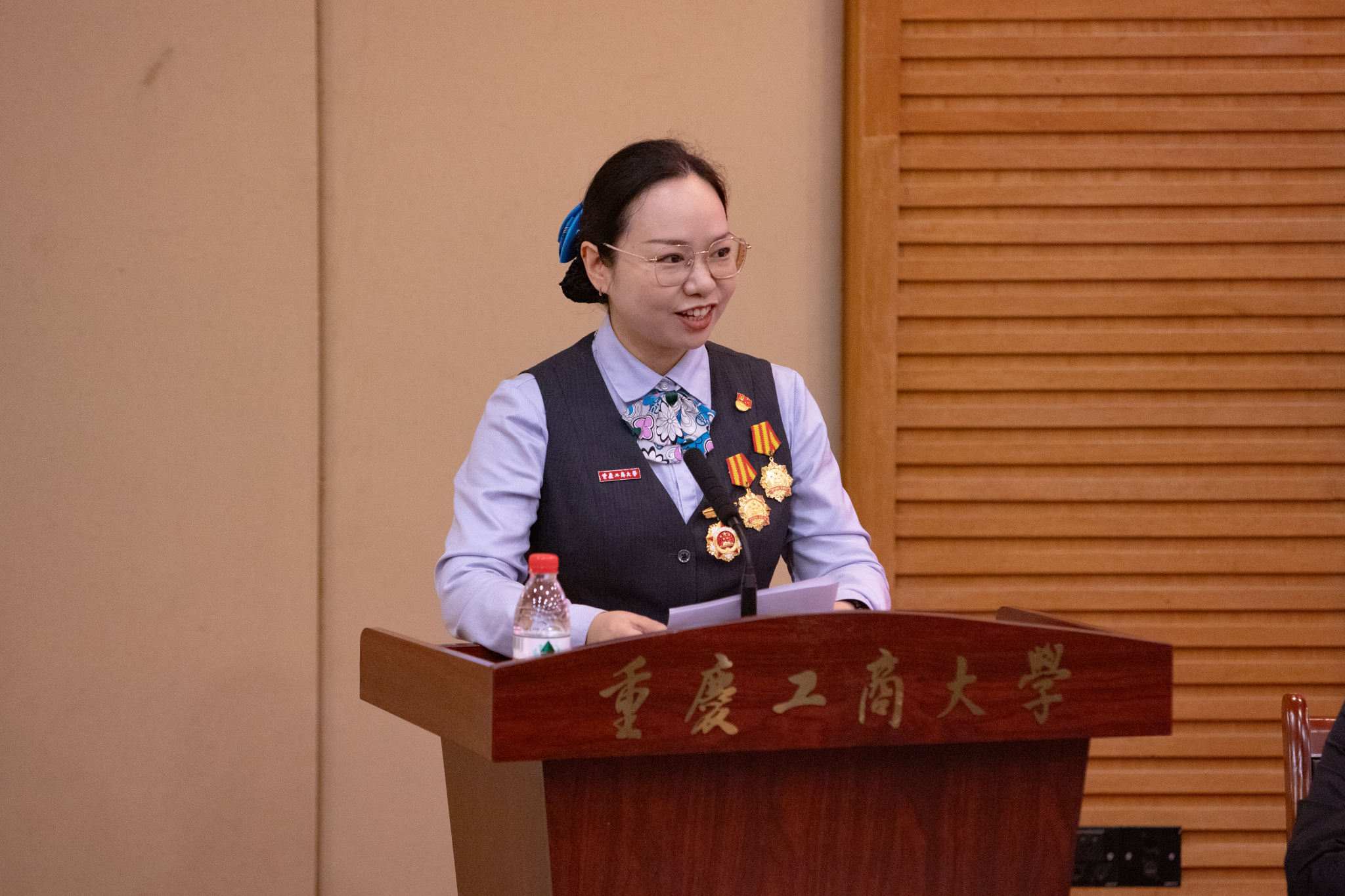 我校成教2005级工商管理专业毕业生、2022年全国五一劳动奖章获得者、2019年全国金融五一劳动奖章获得者、2023金渝奖年度金融人物、农行重庆两江分行营业部高级大堂经理陈希作为校友代表发言。她说母校一直是她最温暖的港湾和最挂念的家园,一直激励着他为金融事业的发展作力所能及的贡献。她勉励全体新同学们在接下来的学习生活中,要珍惜光阴、努力学习、认真工作,在未来的道路上勇敢前行,实现自己的梦想。
