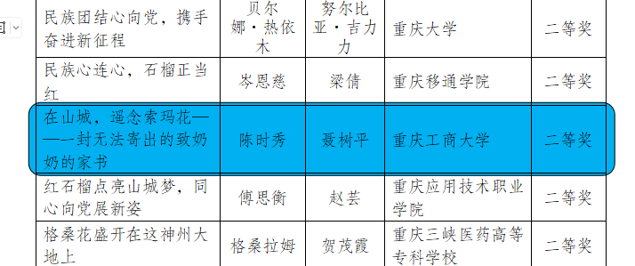 近日,市教委、市委统战部、市民族宗教委通报了全市教育系统“同心跟党走,巴渝石榴红”铸牢中华民族共同体意识教育征文活动的评选结果,我校学生陈时秀的作品《在山城,遥念索玛花——一封无法寄出的致奶奶的家书》(指导教师:聂树平)获二等奖。