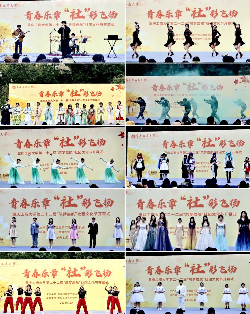 开幕式上,各学生社团以展演的方式将社团的特色、风采演绎得淋漓尽致。Deaf乐队、温度乐队、November乐队率先出场,用一首首音乐串烧点燃全场。体育舞蹈协会带来舞蹈《Latin Girls》、黑马啦啦操协会演绎街舞《Street Dance Fever》,社员们以灵动的舞姿诠释青春律动,将活动现场气氛推向高潮;南山传统文化交流研习社、“墨徵”国潮社舞蹈成员们身着典雅飘逸的汉服,为同学们带来精彩汉服表演,在舞台上绽放典雅风采。国防教育协会社员着整齐军服装,时而穿越浓烟、跨过障碍,时而卧倒隐蔽、迂回前进,时而冲锋陷阵、勇往直前,完美展现飒爽军姿。白洞动漫社cosplay秀《随梦舞步》、C&C彩妆社造型走秀表演以别出心裁的创意,展现青年学子的青春活力和积极向上的精神风貌。演讲与口才协会深情朗诵《复兴颂》、乡村振兴创新孵化工厂协会精心编排歌舞《国家》,以青春之名,诉说对祖国对澄澈挚爱。活动现场热闹非凡,同学们在舞台上尽情展现才华和社团特色,处处洋溢着青年活力。