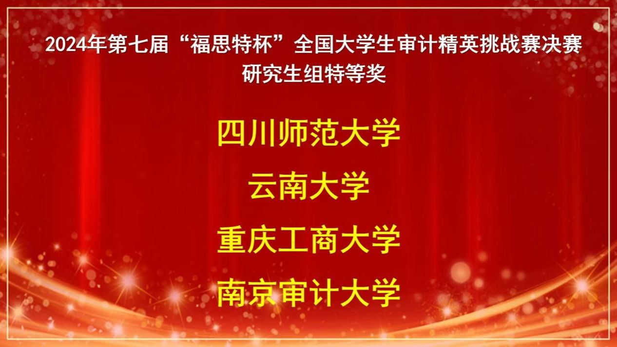 11月30日,第七届“福思特杯”全国大学生审计精英挑战赛在南京审计大学举办。我校会计学院审计专硕2023级万文萱、张新月、2024级杨瑞同学组成的华体会体育·(sports)官方网站代表队在指导老师王杏芬、李晓羽和钟廷勇的指导下,经过激烈角逐获得全国特等奖的优异成绩。该项赛事创办于2018年,是江苏教育厅认定的省级赛事,由中国审计学会审计教育分会主办、南京审计大学政府审计学院承办,广州市福思特科技有限公司提供技术支持。
