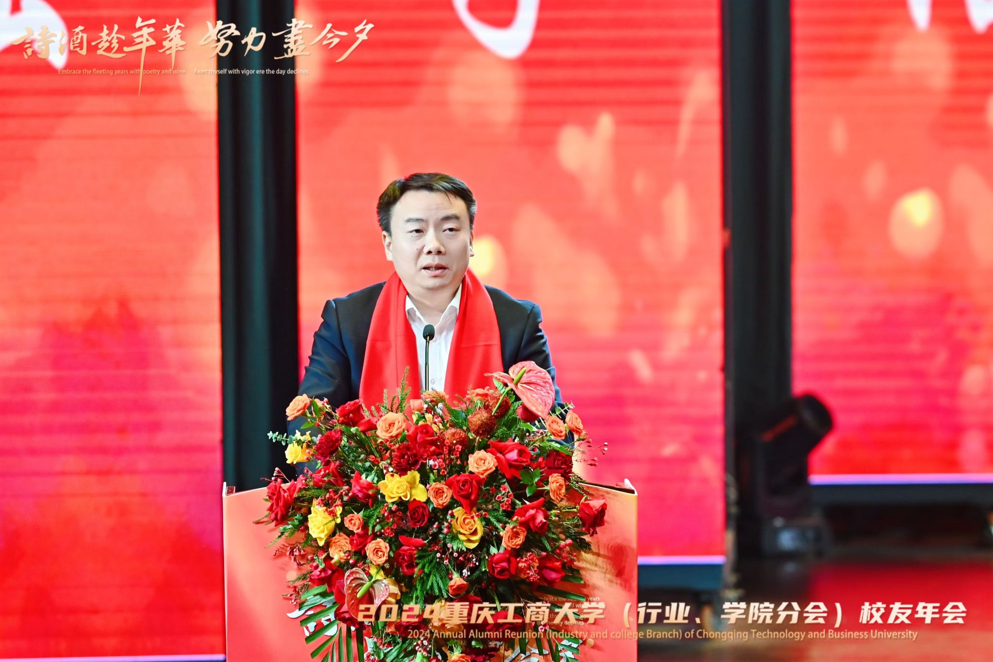 曾维伦在致辞中代表学校向莅临年会的各位领导、嘉宾表示了热烈的欢迎,向长期以来关心、支持学校建设和发展的各级领导、各位校友、各界人士表示了衷心的感谢,向主办、协办年会的各分会以及参与筹备年会的各位校友和赞助商表示了诚挚的谢意,并提前向大家致以新年的问候与美好的祝愿。曾维伦强调,母校是校友共同的精神家园,校友是母校永远的血脉所系。在学校跨越72载的办学历程中,校友始终是母校最为珍视的力量。他在致辞中,同与会校友一起分享了2024年学校打的一系列大仗、硬仗、胜仗,办的一系列大事、要事、喜事。曾维伦指出,今年校友年会“诗酒趁年华,努力尽今夕”的主题,是对中国人精神与生活态度的体现,是对民族精神的传承,也是对重工商大精神、对重庆城市精神一种全新的诠释。希望校友师生弘扬校训、重工商大精神、重庆城市精神,诗文相会、共叙友情,激荡智慧、碰撞思想,分享成长、提振信心,奋励前行、畅想未来。
