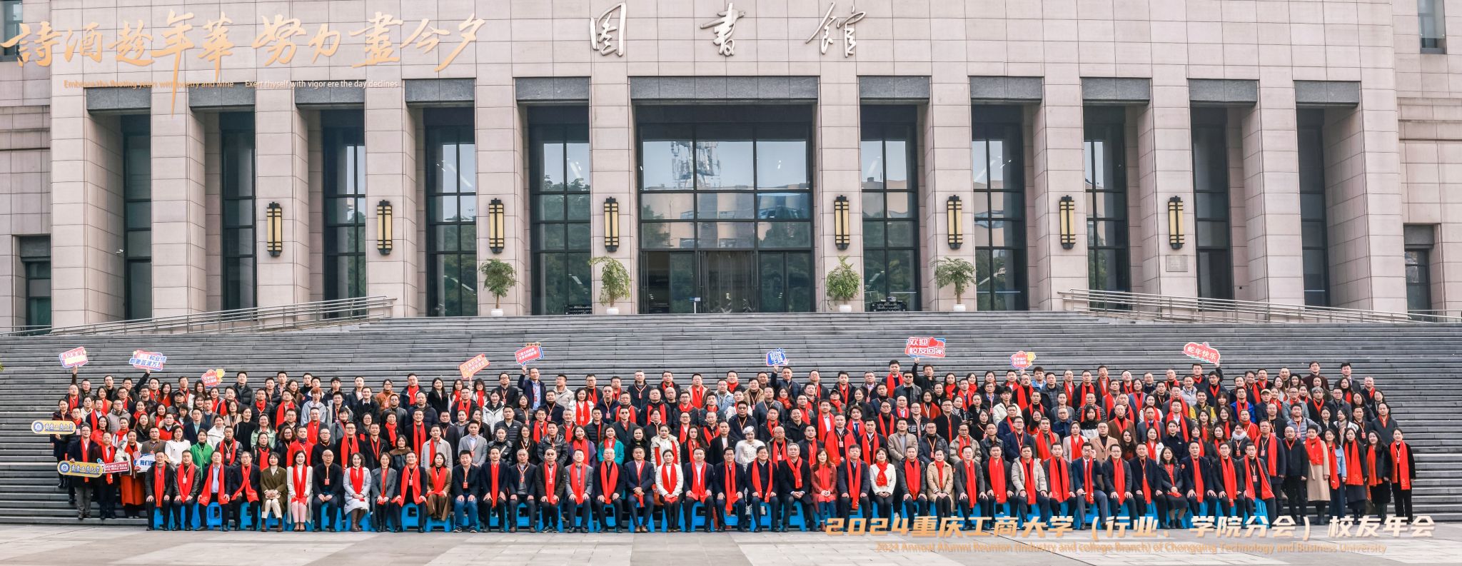年会期间,与会领导、嘉宾与全体参会校友在学校图书馆前合影留念。