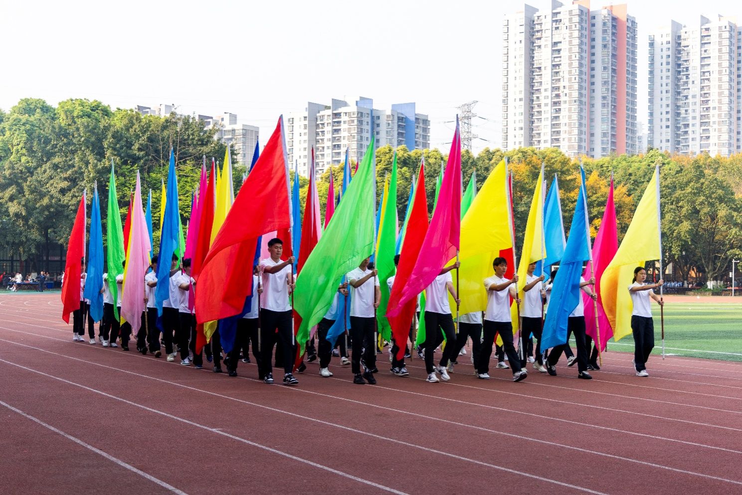 赛场展多彩英姿,运动迎美好未来。入场式上,伴随着激昂的《运动员进行曲》,国旗队迈着铿锵的步伐,紧随其后,会旗队、彩旗队和25个各单位方队依次入场。他们昂首阔步、口号铿锵,用整齐划一的步伐踏响时代强音,充分展现出我校师生朝气蓬勃、积极进取的风采和精神。