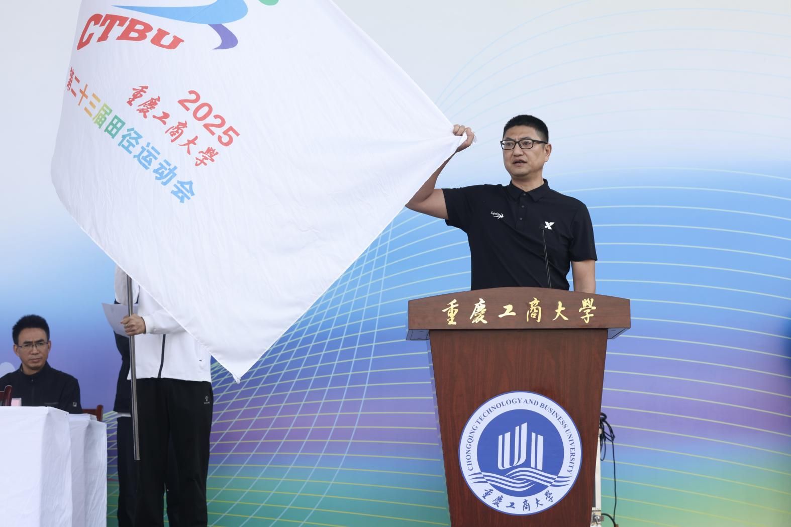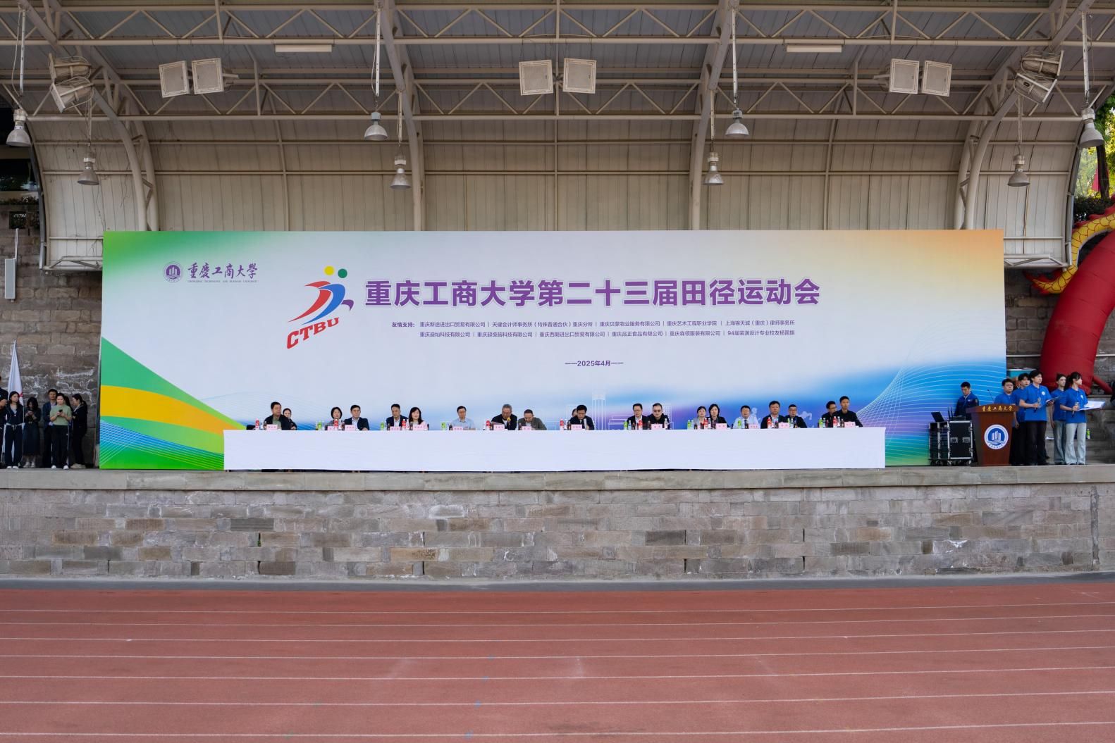田径场上横幅高挂、彩旗飘扬、气氛热烈。2000余名师生、校友代表满怀喜悦,热情洋溢,以饱满的状态共赴这场力与美的运动盛宴,尽显重工商大人团结奋进的校园精神和积极向上的精神风貌。