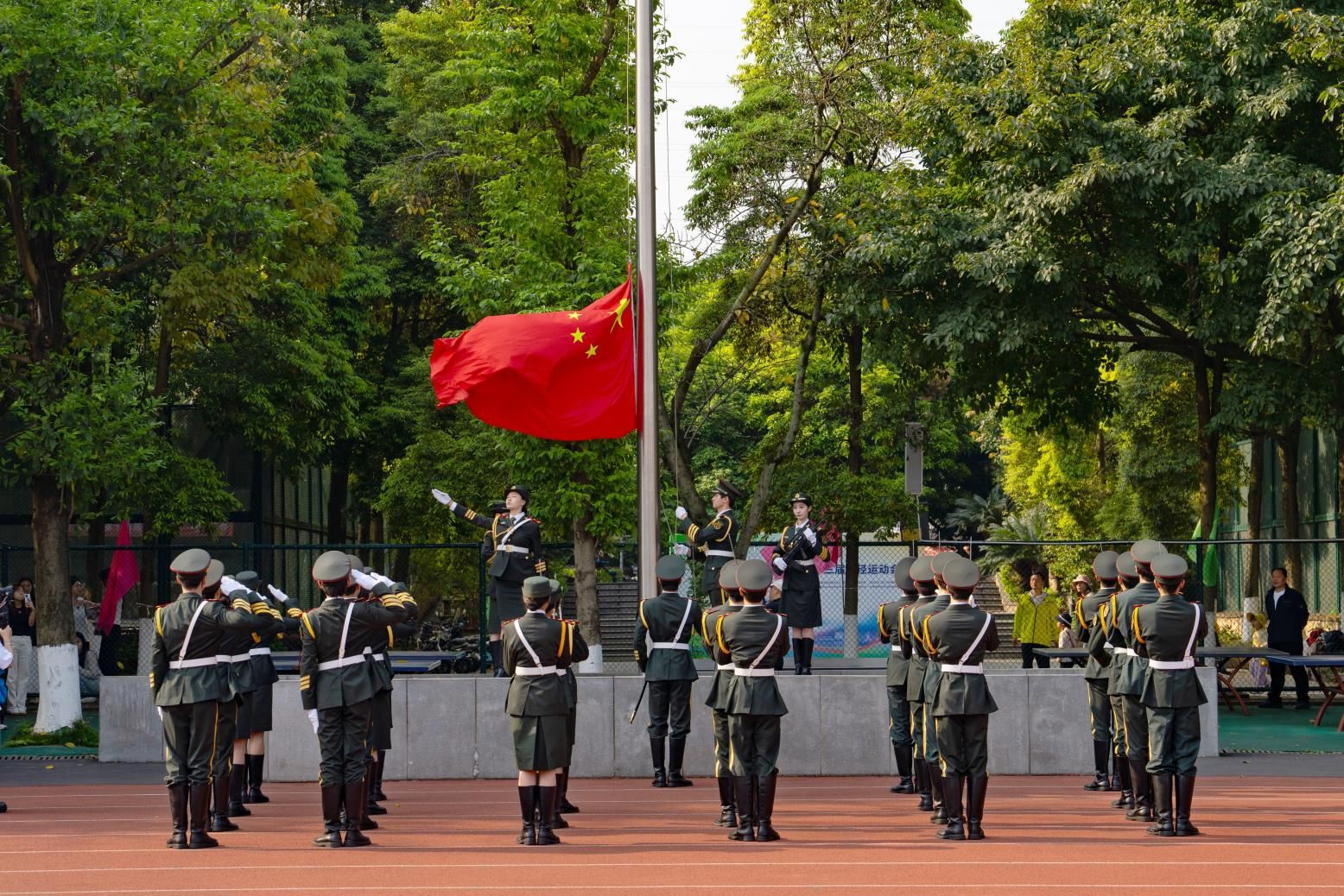 入场式后,伴随着庄严的国歌声,五星红旗缓缓升起,国旗高扬,国歌嘹亮,铿锵旋律点燃激昂斗志。