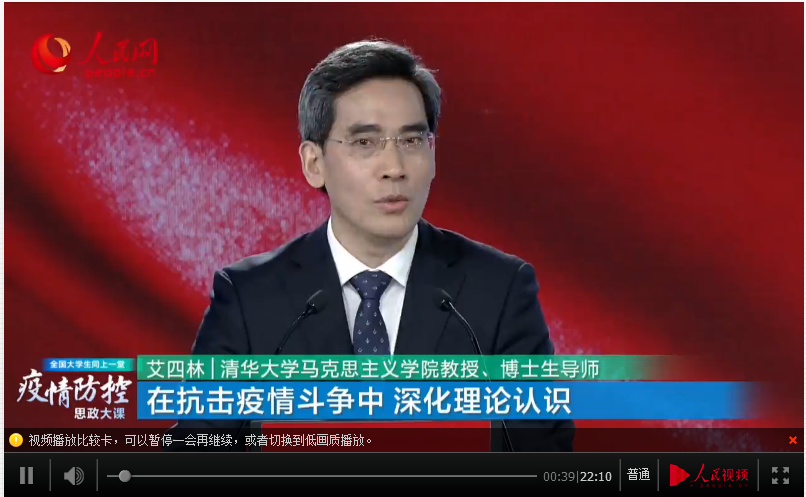 艾四林教授以《在抗击疫情斗争中深化理论认识》为题,立足中国抗击疫情的具体实践,从“确保人民生命安全和身体健康”、“提倡文明健康、绿色环保的生活方式”、“构建战疫命运共同体”三个方面引导学生深化对马克思主义基本理论的认识、深化对马克思主义中国化最新成果的认识。