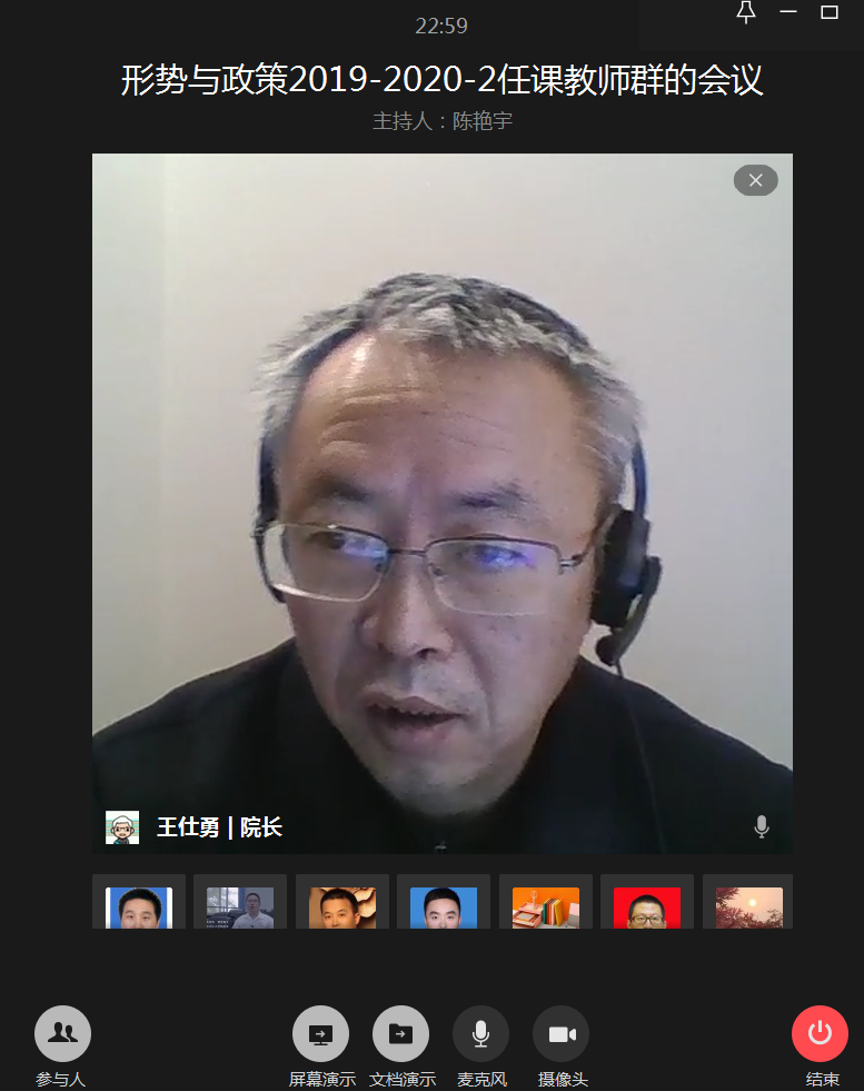 王仕勇就“形势与政策”课的意义和重要性进行了强调,要求教师要全面准确理解和宣传中央政策,既要反映整体面貌,又要突出当前重点。对于当前抗疫情况、经济社会发展工作、党的建设、国际国内形势中的重大问题,学生感兴趣的热点问题,要立场坚定、积极引导、讲解到位。刘富胜从教学时间、教学平台、教学形象和教学纪律四个方面指出了注意事项。要求牢牢把握这门课鲜明的意识形态要求,通过课程教学增强学生对党和国家的方针政策的感性认知和理性认同。