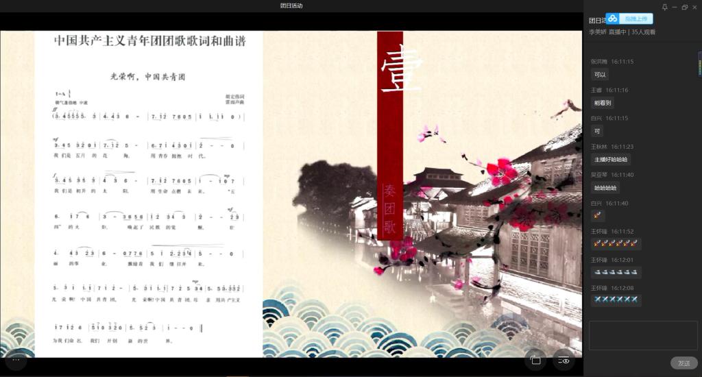 各团支部结合青年学生的特点和喜好,以大家乐于接受和易于接受的方式,融入形式多样、各具特色的活动内容,激发广大青年团员的使命担当,明确抗疫责任要求。有的支部高声齐唱团歌,“我们是五月的花海,用青春拥抱时代……”高昂雄壮的歌声随着网络传向祖国的四面八方,让广大团员感受到了团组织的凝聚力和号召力;有的支部通过线上连麦宣讲防疫小知识,提醒团员同学保护好自身安全,不为国家社会抗疫斗争增加负担,坚决打好这场病毒防疫战;有的支部在线上观看各大防疫战线上逆行者们美丽的身影,将一幅幅感人的画面、一句句温暖的话语,深深地印入了眼里、耳里和心里,在青年团员心中激起一股股无形的强大力量,那就是一定要努力学习,争取以后为国家、为社会、为人民做出更多的贡献;有的支部组织防疫知识竞答比赛,通过抢答方式组织团员同学学习防疫知识,增强防疫意识,提升防疫能力,坚决做到抗疫关键时期不松懈、不懒散、不添乱。此外,有的团支部还号召广大青年团员高效利用宅家时间,认真学习网课,认真完成作业,积极拓展阅读,开展体育锻炼,帮助父母多做家务,体谅父母艰辛,承担为人子女应尽的责任和义务。
