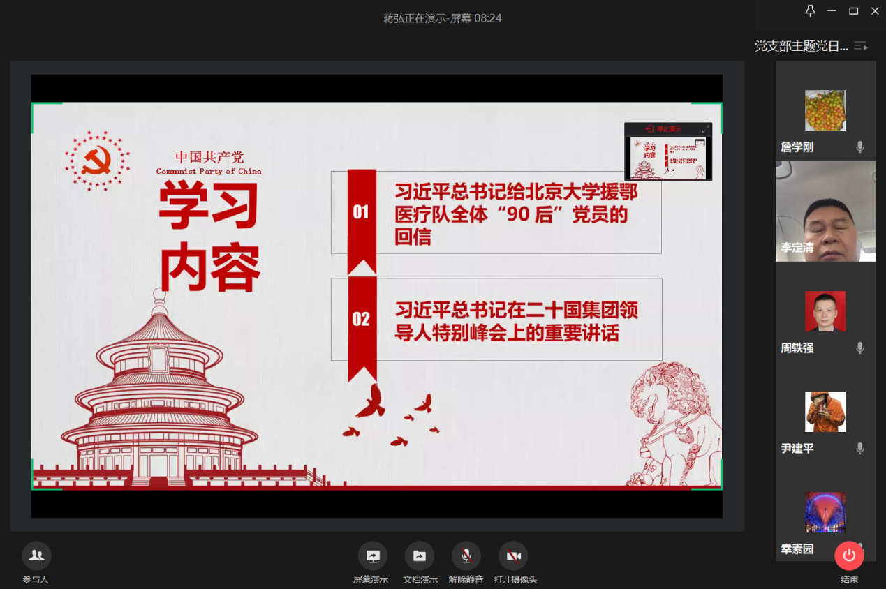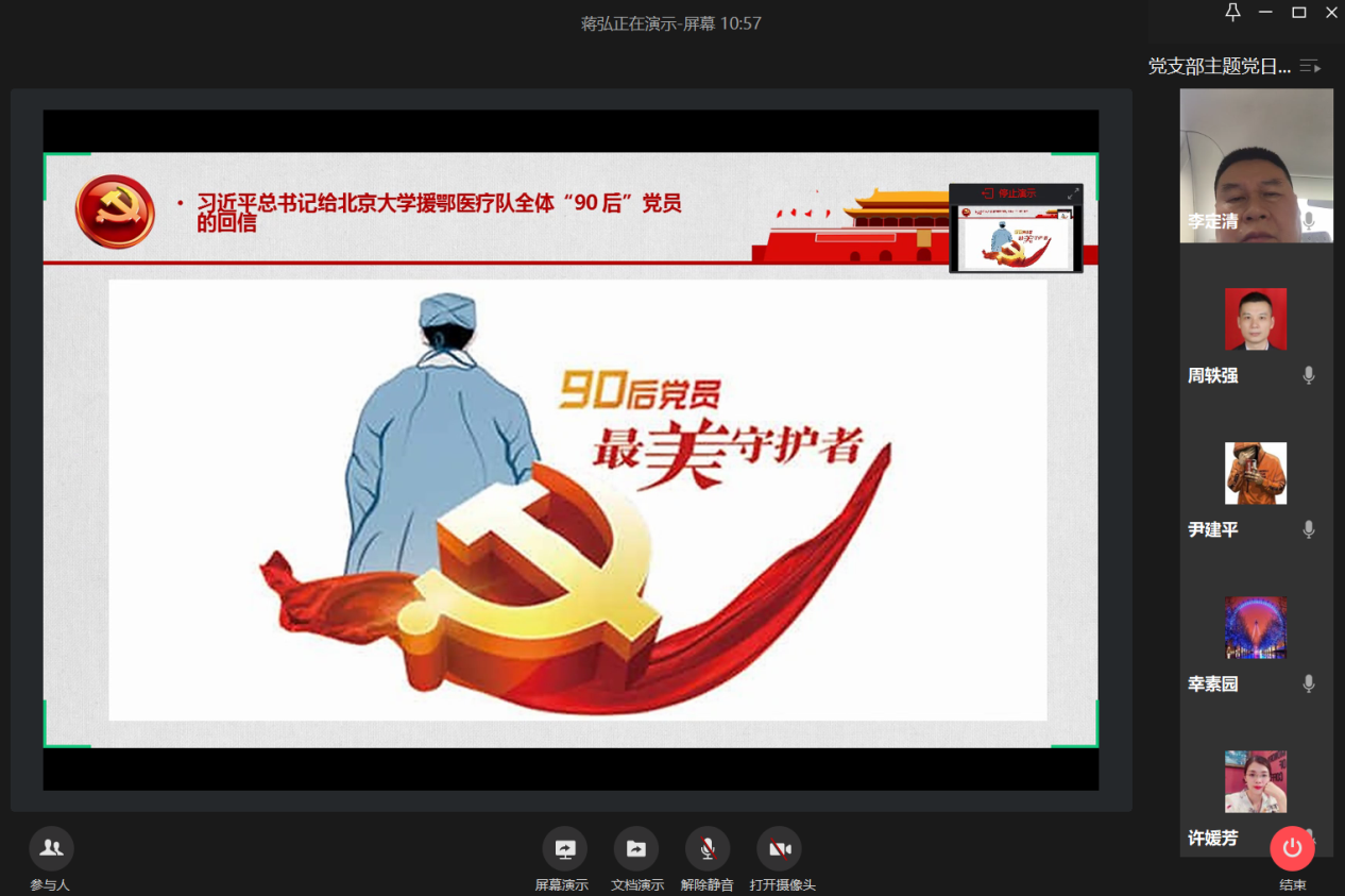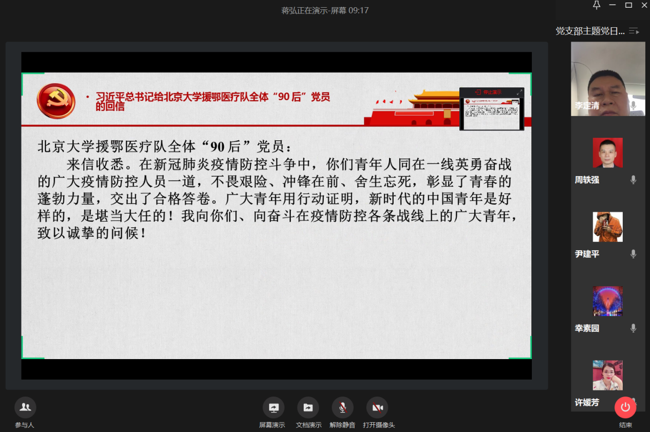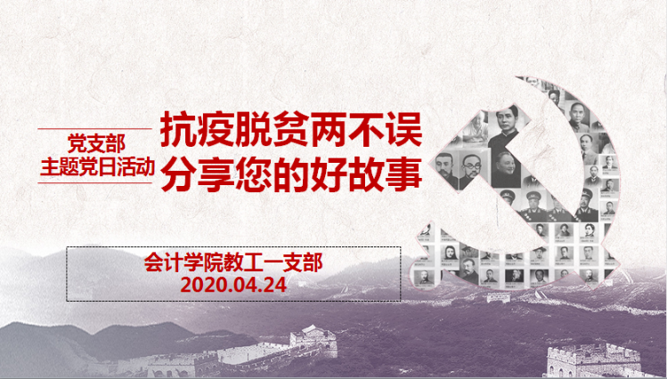 4月24日下午,会计学院教工一支部通过企业微信视频会议召开了“抗疫脱贫两不误,分享您的好故事”主题党日活动,学习了习近平总书记给北京大学援鄂医疗队全体“90后”党员的回信和习近平总书记在二十国集团领导人特别峰会上的重要讲话。党员同志们分享各自了解到的抗疫脱贫事迹,畅谈感受。支部书记蒋弘主持会议。