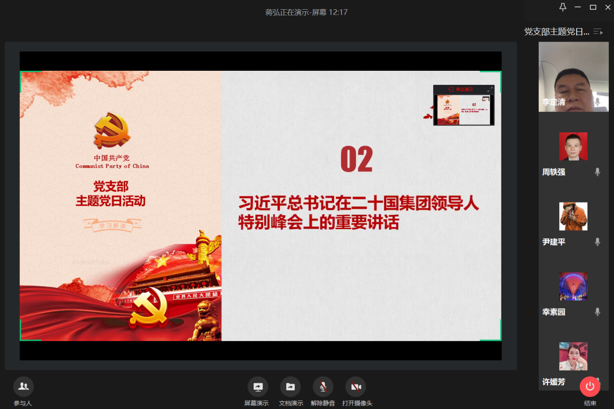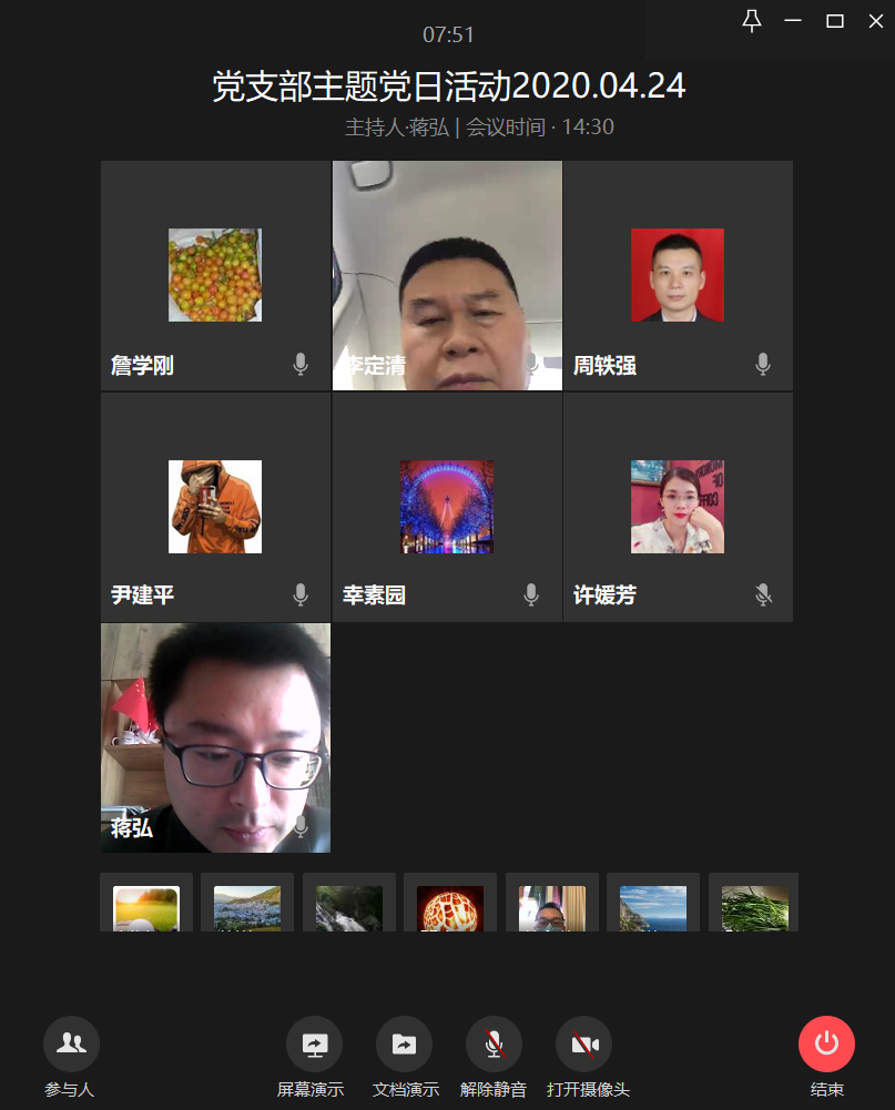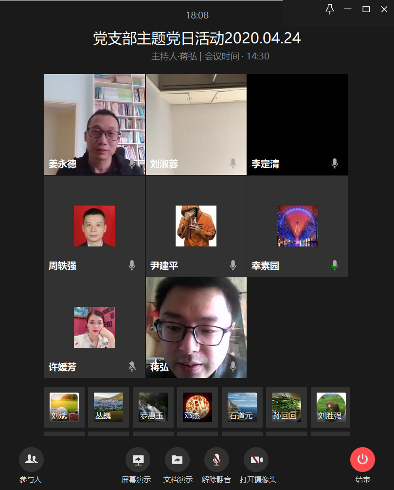 4月24日下午,会计学院教工一支部通过企业微信视频会议召开了“抗疫脱贫两不误,分享您的好故事”主题党日活动,学习了习近平总书记给北京大学援鄂医疗队全体“90后”党员的回信和习近平总书记在二十国集团领导人特别峰会上的重要讲话。党员同志们分享各自了解到的抗疫脱贫事迹,畅谈感受。支部书记蒋弘主持会议。