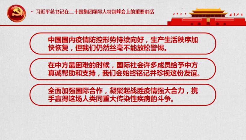 随后,他详细地解读了“习近平总书记在二十国集团领导人特别峰会上的重要讲话”,通过事例让大家理解习近平总书记讲话的精神。比如,习近平总书记在讲话中阐述了我国抗疫的整体情况,指出中国国内疫情防控形势持续向好,生产生活秩序加快恢复,但仍然丝毫不能放松警惕。对此,蒋弘列举了目前我国新冠肺炎患者治愈率达到94%的数据,以及黑龙江省绥芬河市因为输入性确诊病例暴增而成为抗疫最前线、哈尔滨市出现1传78人重大疫情这两个事例。同时,他提醒大家为了保护自己和他人,在复工复产后要戴口罩、勤洗手、不扎堆。