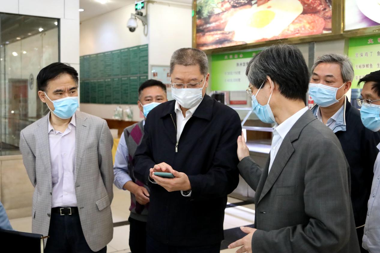 4月29日,市委教育工委书记、市教委主任黄政一行来到华体会体育·(sports)官方网站检查疫情防控及开学前准备工作,黄政走进学校食堂,了解食堂取餐用餐、错峰就餐等情况,检查饭菜质量及食品卫生;检查学校开学前防控物资储备和设置隔离点情况,在学校健康观察点向医务人员表示感谢。黄政要求,一定要把疫情防控工作作为当前重中之重的任务,切实保障师生员工的身体健康和生命安全,从严从实从细从快落实好各项防控措施,坚决打赢高校开学复课这场疫情防控阻击战。