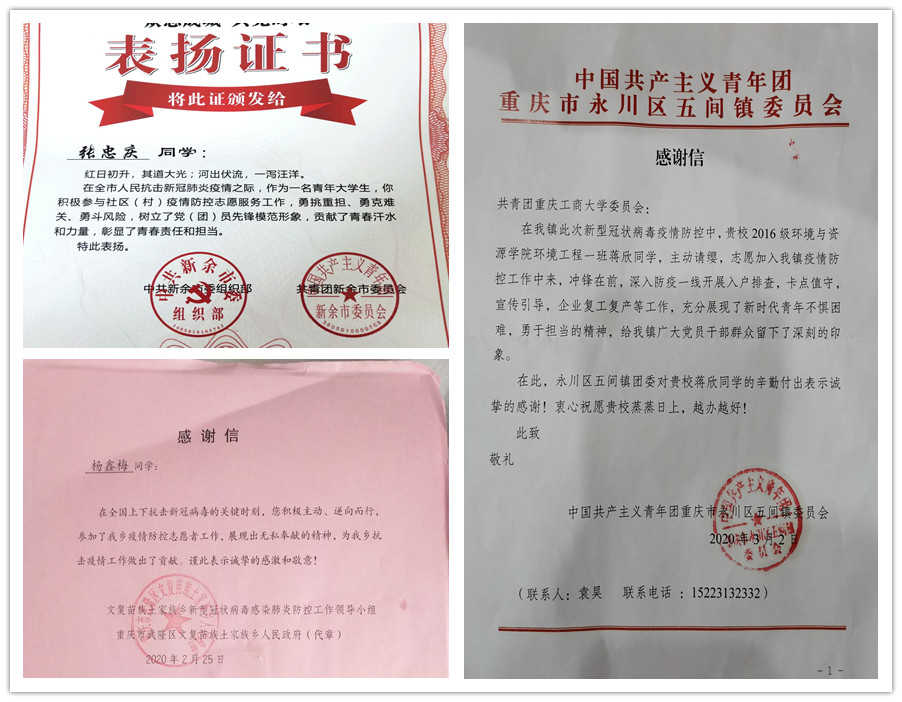 “青春由磨砺而出彩,人生因奋斗而升华”新冠肺炎疫情发生以来,重工商大志愿者们以青春的担当,迅速响应,积极投入,同在一线英勇奋战的广大疫情防控人员一道,不畏艰险、冲锋在前,为夺取疫情防控的胜利注入了鲜活的青春力量。3月以来,我校陆续收到河北曲周共青团、重庆永川五间镇共青团、重庆渝北区古路镇人民政府、山西临汾尧都区刘村镇马站村党支部等单位寄来的200余封感谢信,对我校青年在抗“疫”中的表现给予了高度的肯定和赞扬。