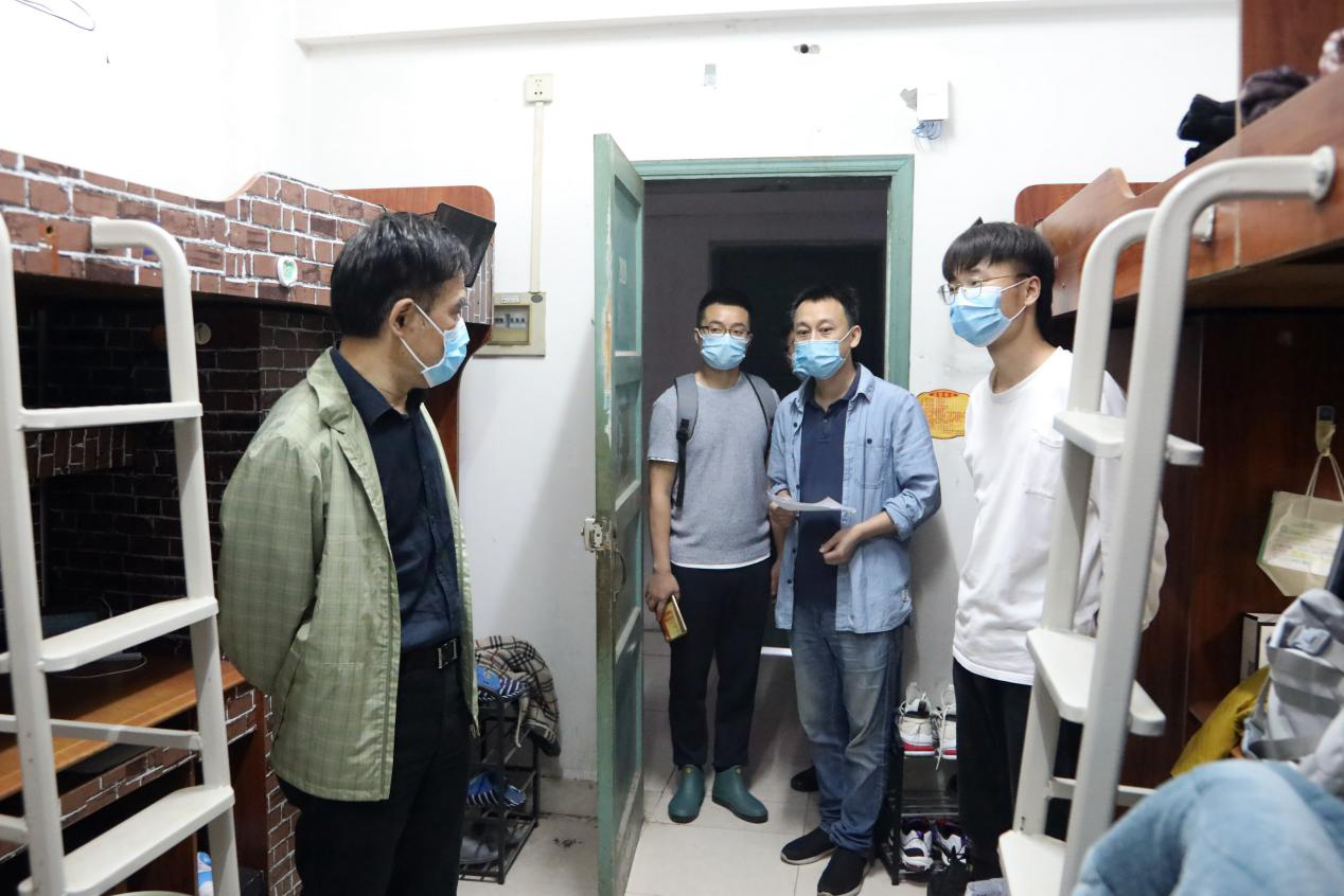 5月14日上午,学校党委书记李志雄和副校长陈兴述、李国军与学校疫情防控工作领导小组部门负责人一行,先后来到校门口和学生宿舍区,再次检查和现场调研学生返校和疫情防控工作开展情况。