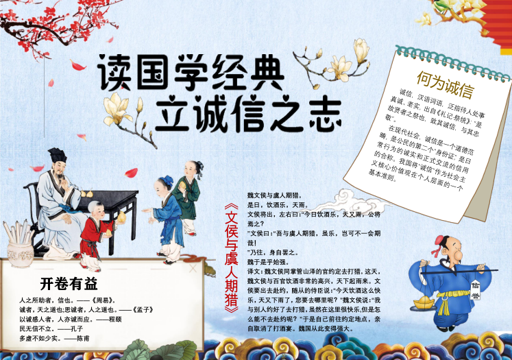 此次活动面向全院同学进行了宣传,特别是针对享受了国家资助的同学,每位参与同学以“读国学经典、立诚信之志”为主题,完成一份电子手抄报或手写手抄报。到活动截止之日,共有52名同学参与该项活动,学院评出了一等奖7名,二等奖21名,三等奖24名。