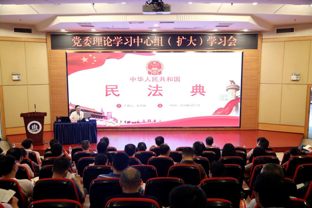 为进一步深入学习贯彻全国两会精神,理解好、贯彻好、运用好《中华人民共和国民法典》(下简称《民法典》),不断提升依法治校水平和能力,6月11日,我校在博智楼7200报告厅召开党委理论学习中心组(扩大)学习会,学习《民法典》。我校法学院教师刘乃睿博士为全体校领导、中层干部作了《民法典》学习辅导报告。学习会由党委常委、宣传部部长华杰主持。