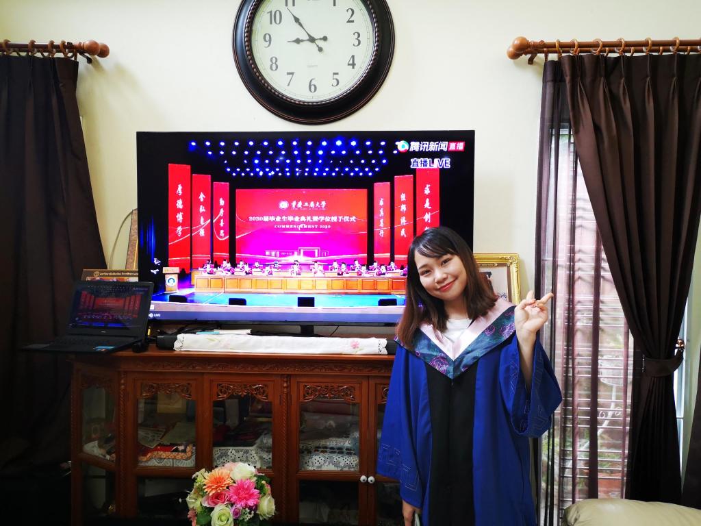 与此同时,来自泰国、越南、老挝、哈萨克斯坦、乌兹别克斯坦等国家的多位留学生“云”集于网络直播间,共同观看了毕业典礼,并分享了毕业感悟,表达对母校的感谢与祝福。我校越南籍国际经济与贸易专业本科生文财今天特意向公司请了假,专心观看毕业典礼。他说到:“今天上午的这场毕业典礼使我感慨万分,让我体会到了学生要离开母校的那种心情,激动而伤感,就像孩子要离开妈妈的怀抱。在华体会体育·(sports)官方网站学习的这几年,成为我一生中最重要的财富。感谢老师们对我的培养、支持与照顾。”来自泰国的企业管理专业研究生邱丽芳更是在家里穿着学位服观看了毕业典礼,仪式感十足。华体会体育·(sports)官方网站对他们来说,早已不是路过的风景,而是实实在在温暖的家!