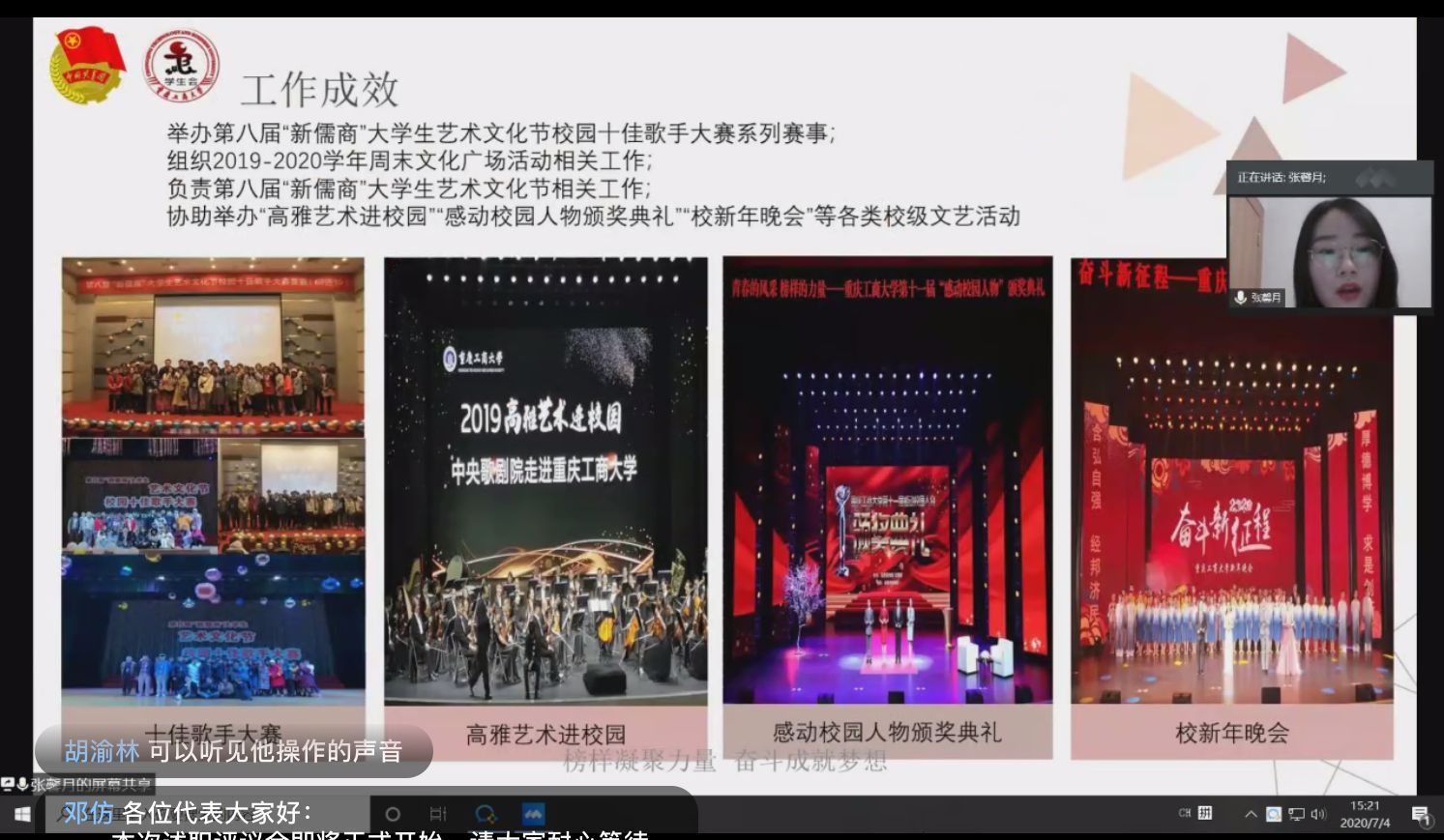 为深入贯彻习近平新时代中国特色社会主义思想特别是习近平总书记关于青年工作的重要思想,按照团中央、教育部、全国学联《关于推动高校学生会(研究生会)深化改革的若干意见》通知要求,7月4日下午,我校通过企业微信和腾讯直播等平台举办校学生会述职评议会。学校党委学工部副部长潘焱、团委书记杨娟及来自校学生会、学院学生会140名学生代表参加了评议会。会议由校团委副书记、校学生会秘书长陆嘉主持。