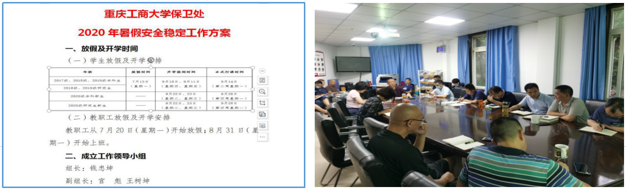 每天安排一名处领导带班,对干部值班、队员上班进行明察暗访;安保大队队长对安保队员是否在岗、在岗状态、履职尽责情况等进行全方位督查。通过督查,值班干部在岗值班、安保队员在岗履责情况均较好,暑期以来,各项工作推进有力,工作效果突出。7月31日上午,钱忠坤处长召开了暑期疫情防控和安稳工作推进会,对前期工作进行了总结,分析研判了今后一个时期的安稳形势,安排部署了八月份的相关工作。