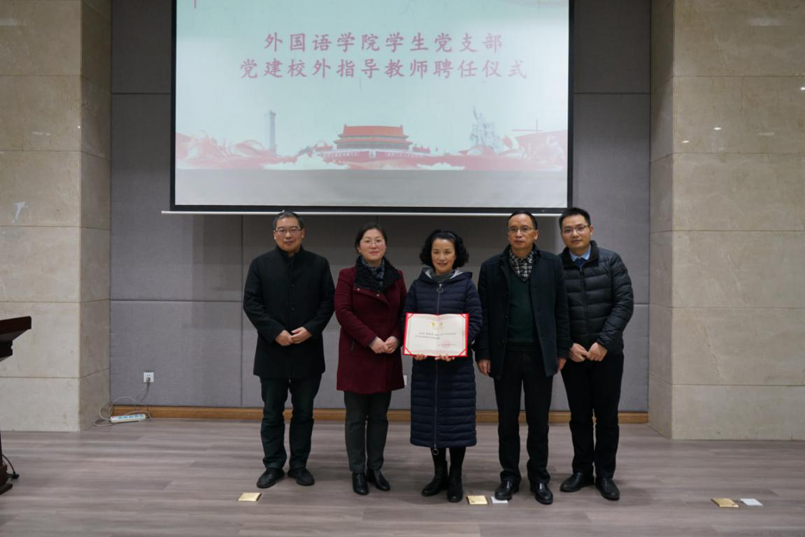 唐春秋代表外国语学院分党委致辞,他对各位嘉宾和领导的到来表示诚挚欢迎,勉励同学们要积极弘扬劳模精神,争做新时代的奋斗者。于频、尹建平共同为陆远秀颁发外国语学院学生党支部党建校外指导老师聘书。