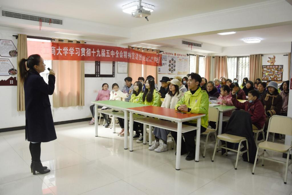 学生宣讲团成员、校学生会主席团成员、国际商学院2018级国际经济与贸易班刘星驿在南湖社区志愿服务基地为社区居民宣讲党的十九届五中全会精神。他表示,未来五年正是当代青年走入社会,甩开臂膀干事创业的时候,青年学生有责任积极学习和践行全会精神,将自己的成长与国家发展结合起来,通过自身奋斗讲好中国故事,传播中国声音。