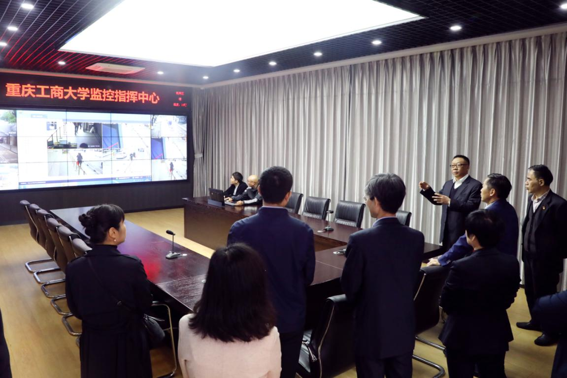 钟登华一行调研了重庆市高校网络舆情与思想动态研究咨政中心,实地参观了“小红帽”党建基地,并现场体验了我校安全稳定人防技防工作开展场景。在调研过程中,钟登华与舆情中心专家学者、“小红帽”党建基地正在开展活动的师生进行了亲切交谈,听取了学校保卫处负责人工作汇报。