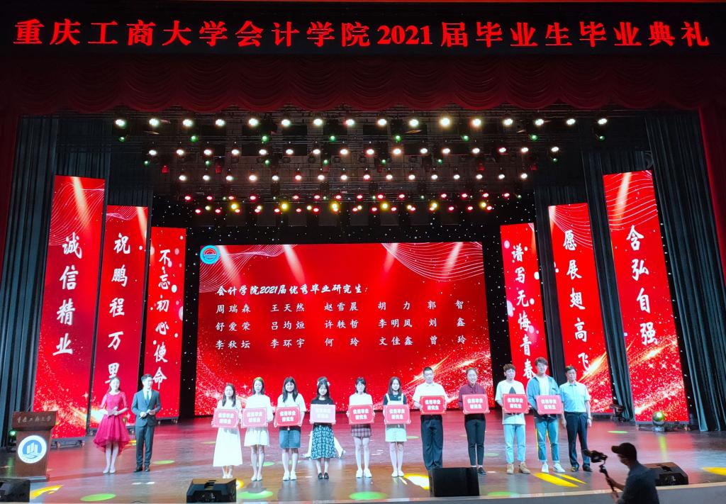 5月16日晚,会计学院在南岸校区图书馆剧场举行2021届毕业生毕业典礼。校党委副书记宋豫、副校长陈兴述出席典礼,学生处副处长尹建平、会计学院党政班子成员、校友代表、重庆中冶宏胤贸易有限公司董事长张再鑫,以及师生代表、家长代表等参加了此次典礼。