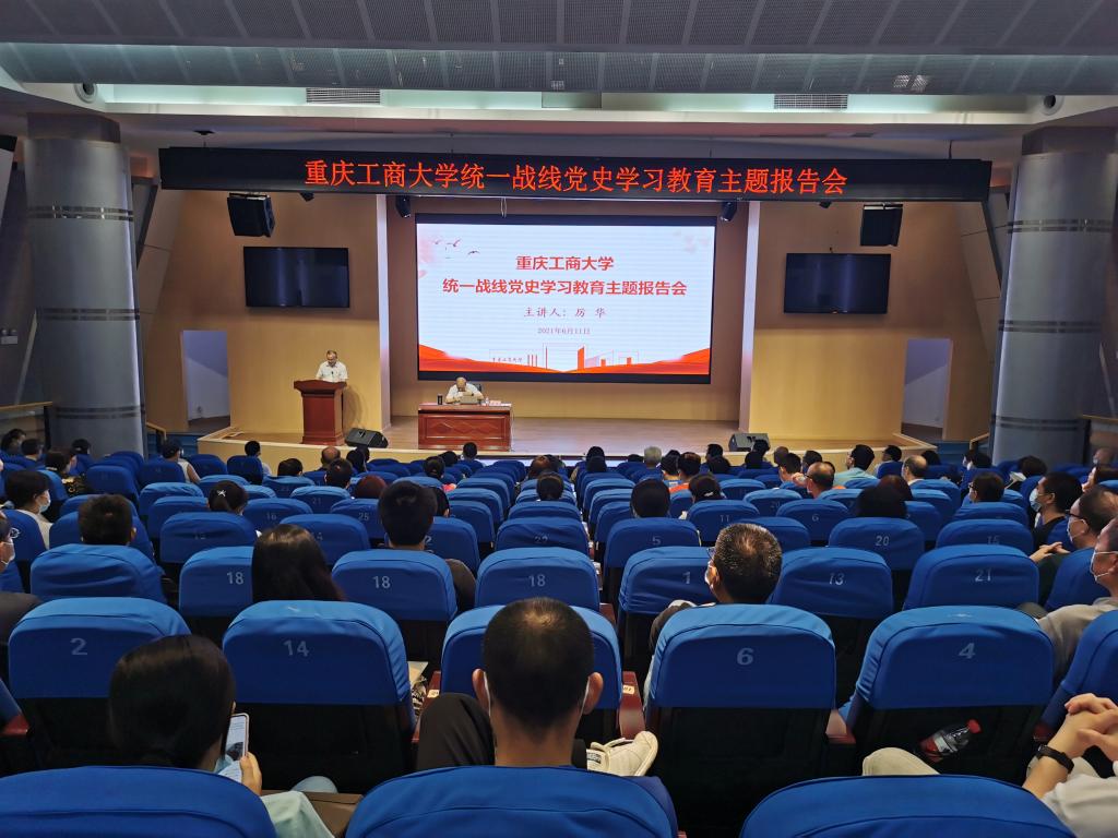 按照全市统战工作“迈新步开新局”主题年活动和统一战线“学党史、讲《条例》、增合力、促发展”大走访大谈心活动的总体要求,紧扣市委统战部关于支持全市各民主党派开展中共党史学习教育实施方案和学校的具体安排,6月11日下午,学校在明智楼学术报告厅举办统一战线党史学习教育主题报告会,邀请原重庆红岩联线文化发展管理中心主任、重庆红岩历史博物馆馆长、中国民主党派历史陈列馆馆长厉华作题为《中国共产党致胜法宝——统一战线》的主题报告。全校各学院党委(党总支)、机关党委统战委员,各学院教工党支部统战委员、机关党委各党支部统战委员,各民主党派基层组织主委、副主委、委员和统战团体班子成员,各民主党派基层组织和统战团体成员以及马克思主义学院研究生代表聆听了报告。报告会由学校党委统战部常务副部长陈松主持。
