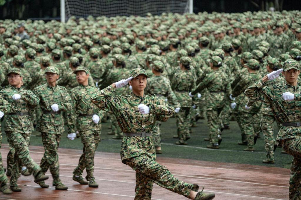 笼罩于淅淅小雨之下,分列式方阵精神饱满、昂首挺胸,齐步到正步的整齐变化体现的是队列同学的团结一心,他们以铿锵有力的步伐展示了我校学子自信昂扬的姿态;军体拳方阵气势磅礴,雄厚的声音吼出的是男儿的铁血方刚,他们以刚劲有力的动作彰显了重工商学子锐意进取的优秀品质;匕首操方阵势如破竹、英姿飒爽,男儿的豪迈气概和女孩的英姿飒爽相交融合,他们一齐展现了新时代青年朝气蓬勃的精神面貌。由退伍学生与体育学院健儿们组成的战术方阵用专业精彩、扣人心弦的表演描述了边防官兵保家卫国、不怕牺牲的英雄气概。复兴方阵以整齐划一的步伐迈向主席台,伴随着指挥员的解说词与大气恢弘的背景乐,2800名女生用红黄底板准确地摆出“1921”“2021”“红船”“天安门”“长城”“CTBU”“工商大学”“校徽”等图案,表达了对祖国大好河山的热爱之情,以及不忘初心跟党前行的坚定信念,当复兴方阵即将摆出“巨轮”图案之时,天空陡然降下瓢泼大雨,似印证其“长风破浪会有时,直挂云帆济沧海”的伟大理想。在党旗方阵的带领下,全体参训人员进行宣誓。