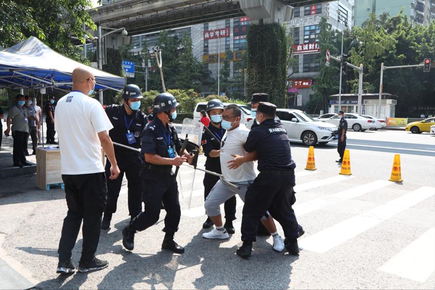 结合各种突发情况,此次演练共设置了外来人员试图暴力进校、外来体温异常人员进校、外来驾驶人员强行开车进校、体温异常同学入校四个场景。
