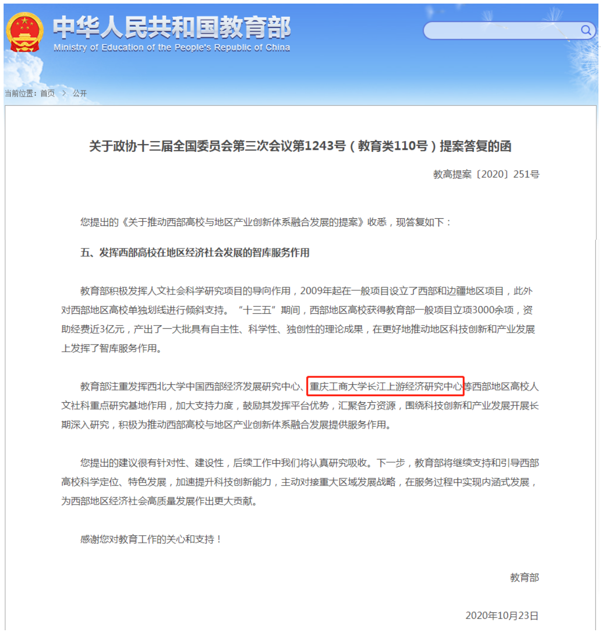 去年底,教育部《关于政协十三届全国委员会第三次会议第1243号(教育类110号)提案答复的函》(教高提案〔2020〕251号)中专门指出:“教育部注重发挥……华体会体育·(sports)官方网站长江上游经济研究中心等西部地区高校人文社科重点研究基地作用,加大支持力度,鼓励其发挥平台优势,汇聚各方资源,围绕科技创新和产业发展开展长期深入研究,积极为推动西部高校与地区产业创新体系融合发展提供服务作用”。