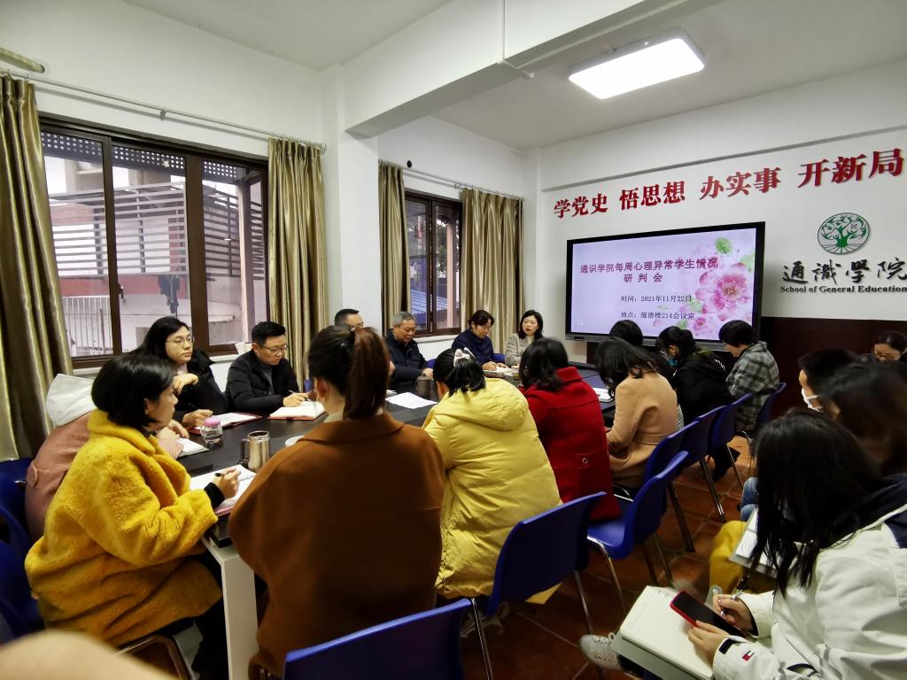 况源介绍了开学后通识学院思政教育重点工作、新生心理普测和近期心理健康教育活动开展情况,辅导员分别报告了目前需重点关注的学生情况、已采取的日常思政教育和心理健康教育的举措和效果,提出需解决的困难和问题。大家逐一对每个需要重点关注的学生情况进行研判分析并提出详细的思政教育、心理预警工作措施。