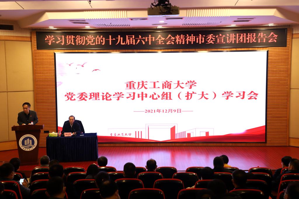 12月9日下午,我校召开党委理论学习中心组(扩大)学习会,深入学习贯彻党的十九届六中全会精神。市委宣讲团成员、市委党校(重庆行政学院)常务副校(院)长谢金峰同志为我校师生作专题辅导报告。校党委书记李志雄主持会议并讲话。
