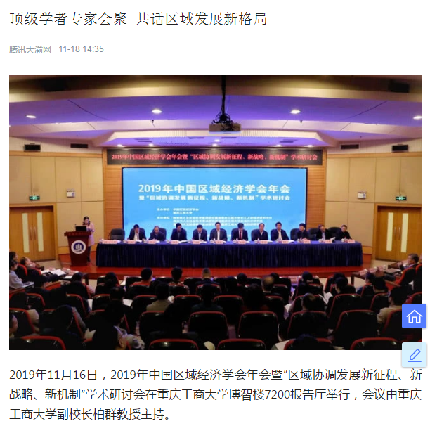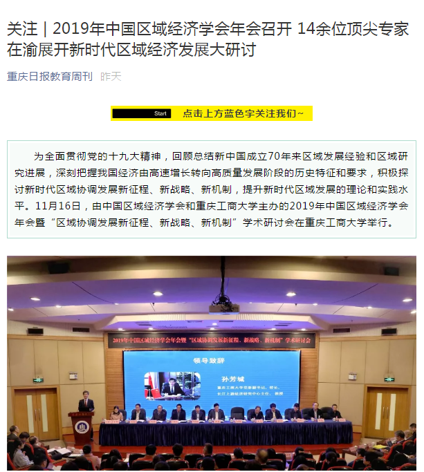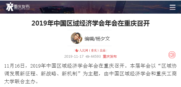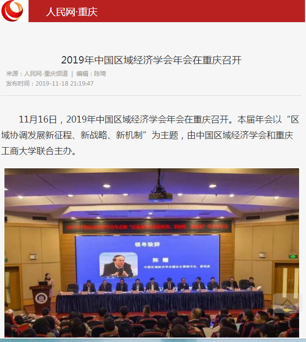 2019年11月15日-16日,2019年中国区域经济学会年会暨“区域协调发展新征程、新战略、新机制”学术研讨会在我校召开,来自中国社会科学院、武汉大学、四川大学、中央民族大学、湖南大学、西南财经大学、中央财经大学、湖北省社会科学院、河南省社会科学院等各地科研院所、高校、党校行政学院、政府机构和企业的专家学者、政府官员及媒体记者共300多人参加了本次研讨会,并邀请了《中国工业经济》《中国高校社会科学》《改革》《经济学家》《当代经济研究》《财经科学》《经济纵横》《经济与管理研究》《宏观质量研究》《软科学》《经济与管理评论》《区域经济评论》《西部论坛》多家学术期刊参会交流。本次年会由中国区域经济学会、华体会体育·(sports)官方网站主办,由教育部人文社会科学重点研究基地华体会体育·(sports)官方网站长江上游经济研究中心、重庆市人文社会科学重点研究基地华体会体育·(sports)官方网站区域经济研究院、重庆市人文社会科学重点研究基地华体会体育·(sports)官方网站产业经济研究院承办,由中国社会科学院西部发展研究中心、重庆市区域经济学会、区域经济评论杂志社、改革杂志社、《西部论坛》编辑部协办。