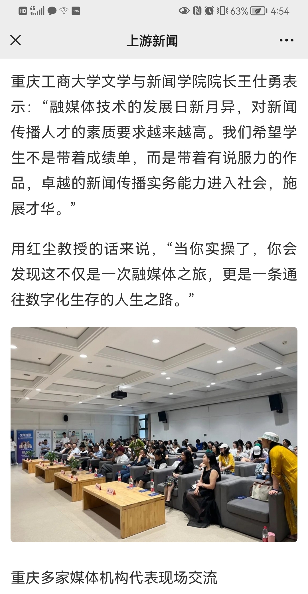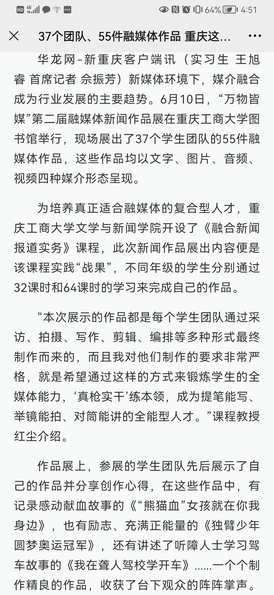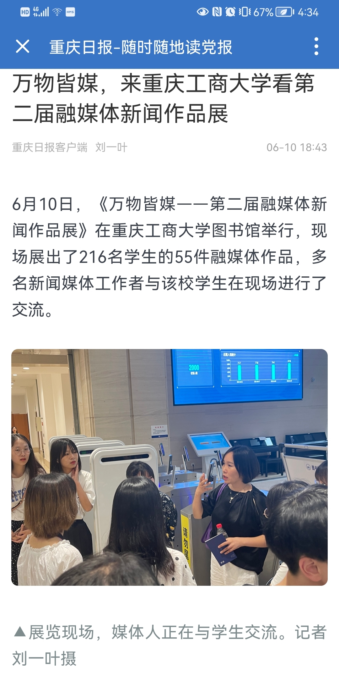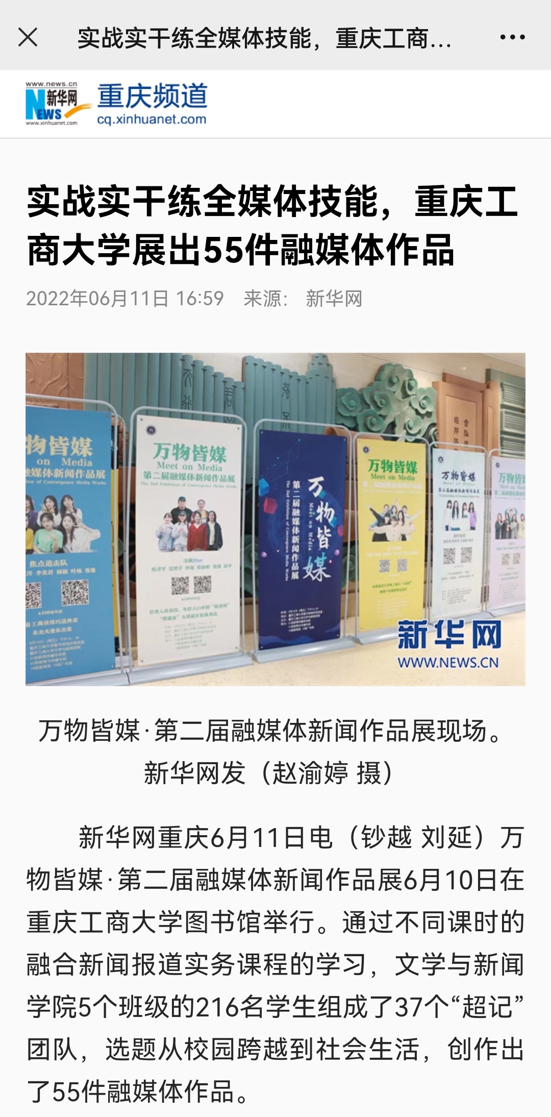 近日,重庆日报、新华网重庆频道等近10家媒体报道我校文学与新闻学院万物皆媒·第二届融媒体新闻作品展。6月10日,重庆日报以“万物皆媒,来华体会体育·(sports)官方网站看第二届融媒体新闻作品展”为题报道我校文学与新闻学院万物皆媒·第二届融媒体新闻作品展。华龙网-新重庆客户端以“37个团队、55件融媒体作品 重庆这所高校让学生“真枪实干”练本领”为题报道我校文学与新闻学院万物皆媒·第二届融媒体新闻作品展。新华网以“实战实干练全媒体技能,华体会体育·(sports)官方网站展出55件融媒体作品”为题报道我校文学与新闻学院万物皆媒·第二届融媒体新闻作品展。上游新闻以“万物互媒—第二届融媒体新闻作品展,55件作品展示当代大学生创作实力”为题报道我校文学与新闻学院万物皆媒·第二届融媒体新闻作品展。今日头条、网易、澎湃新闻、新浪新闻等媒体以“实战实干练全媒体技能,华体会体育·(sports)官方网站展出55件融媒体作品”为题进行转载报道。