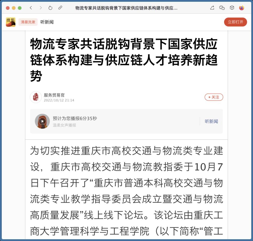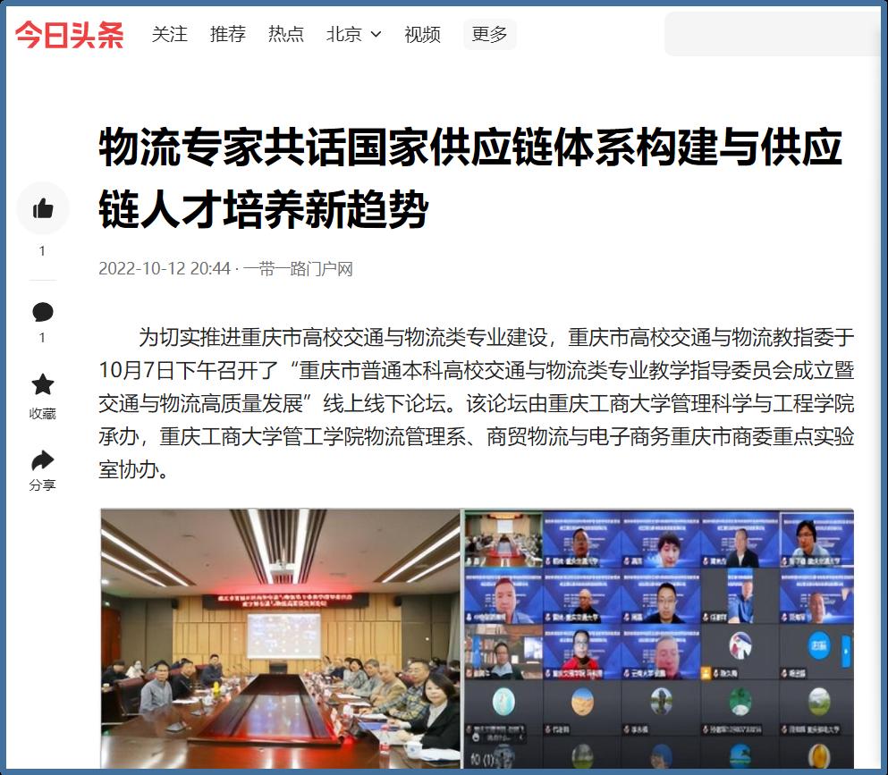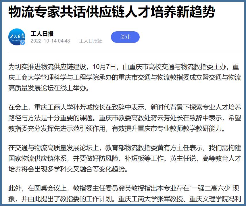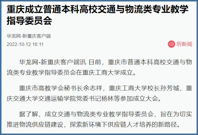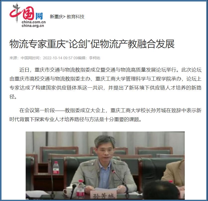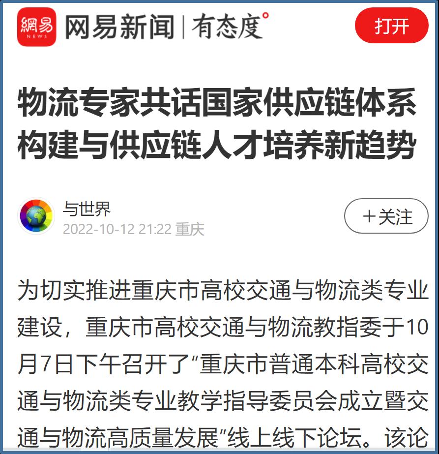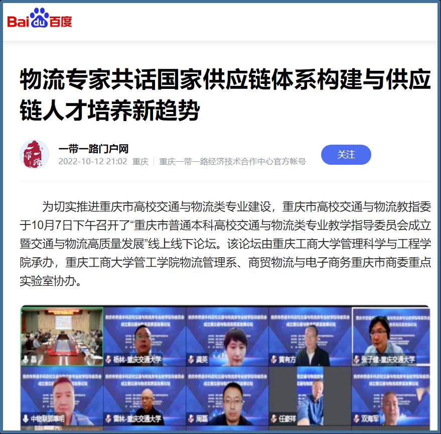 近日,中国网、工人日报、华龙网、今日头条、百度新闻、网易新闻、搜狐新闻等多家主流媒体聚焦交通与物流教指委成立、国家供应链体系构建、供应链人才培养新趋势等内容,对我校成功举办“重庆市交通与物流教指委成立暨交通与物流高质量发展论坛”进行广泛报道。成立大会上,华体会体育·(sports)官方网站校长孙芳城和市教委高教处处长蒋云芳致辞,高教学会秘书长余志祥宣读委员名单。论坛上教育部高校物流教指委主任黄有方、秘书长郭肇明、中国物流学会会长任豪祥、重庆市交通与物流教指委主任龚英、副主任雷林、副主任付启敏发表主旨演讲。圆桌会议上龚英、提出了工作计划,张军主任、冯利朋院长、陈坚副院长等就各自学校的一流专业经验进行了分享,其他委员为教指委的发展积极建言献策。会议由重庆市交通与物流教指委秘书长陈久梅和管理科学与工程学院院长黄钟仪副主任主持。来自教指委的委员以及全国各地物流本科院校的老师、行业协会等70余人参加本次论坛。