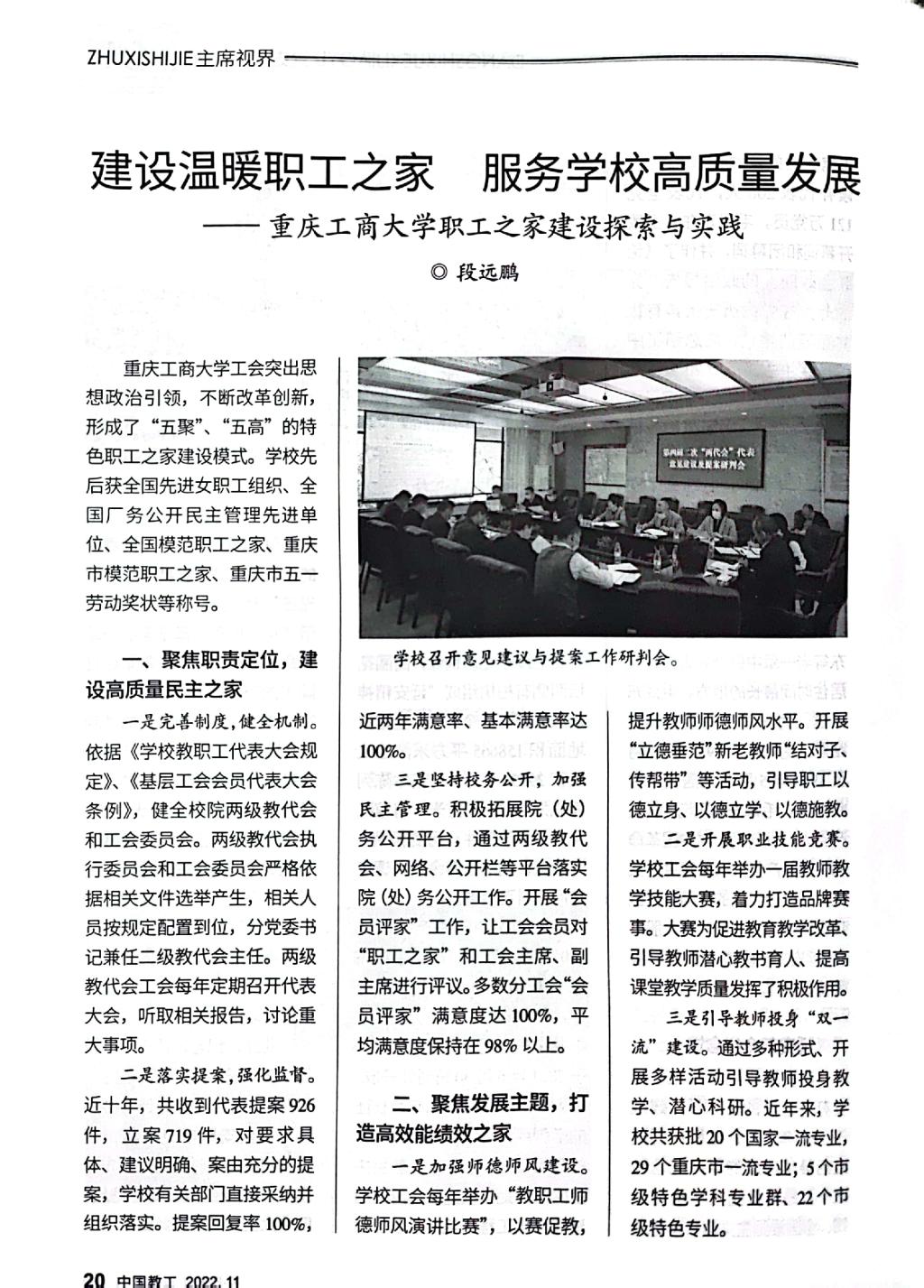 《中国教工》是中华全国总工会主管的中国教科文卫体工会会刊,该刊2022年第11期刊发了我校工会以《建设温暖职工之家,服务学校高质量发展——华体会体育·(sports)官方网站职工之家建设探索与实践》为题的职工之家建设经验文章。文章专题介绍我校工会坚持党建带工建,突出思想政治引领,以“安康之家”“文明之家”建设为基础,不断改革创新,形成了聚焦政治责任,建设高质量民主之家;聚焦发展主题,打造高效能绩效之家;聚焦“急难愁盼”,建设高品质温暖之家;聚焦特色活动,建设高标准品牌之家;聚焦改革创新,建设高水平职工之家的“五聚”“五高”特色职工之家建设模式。