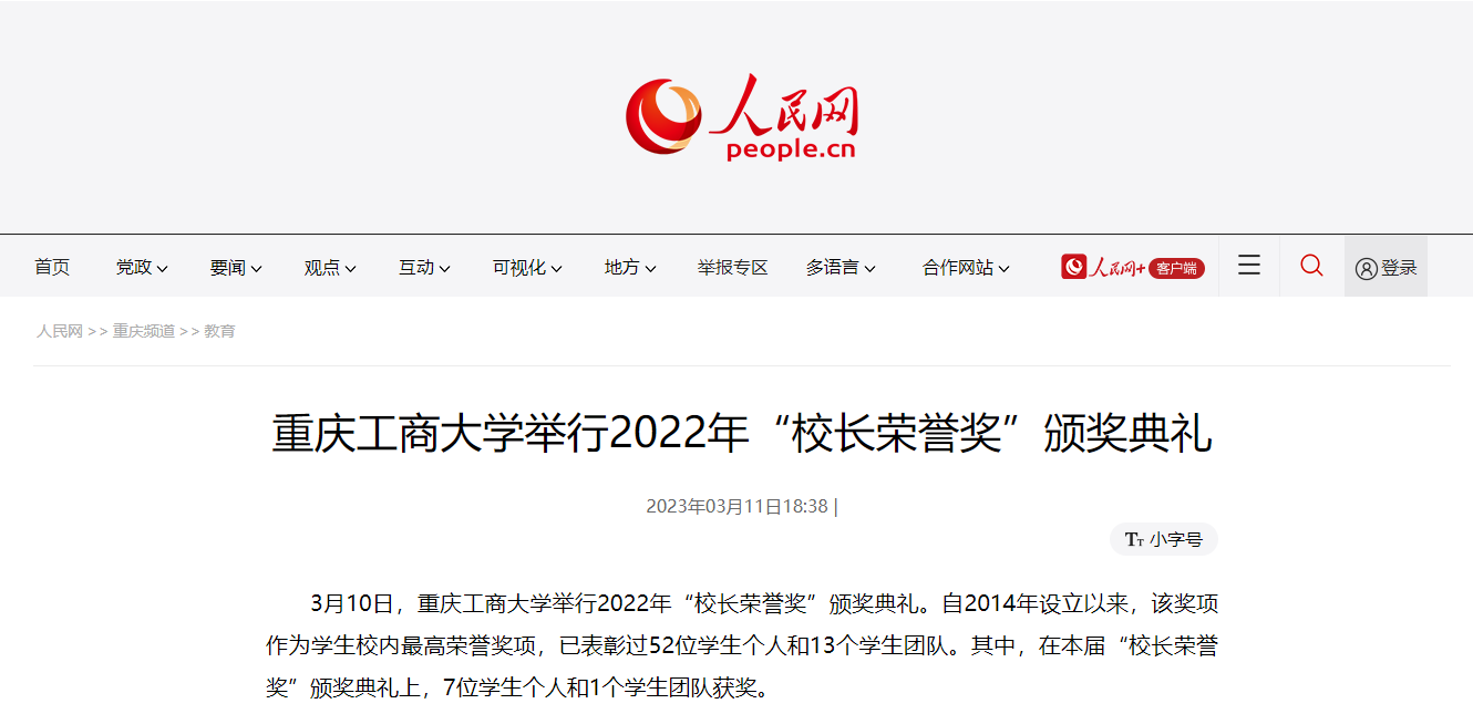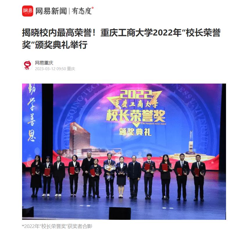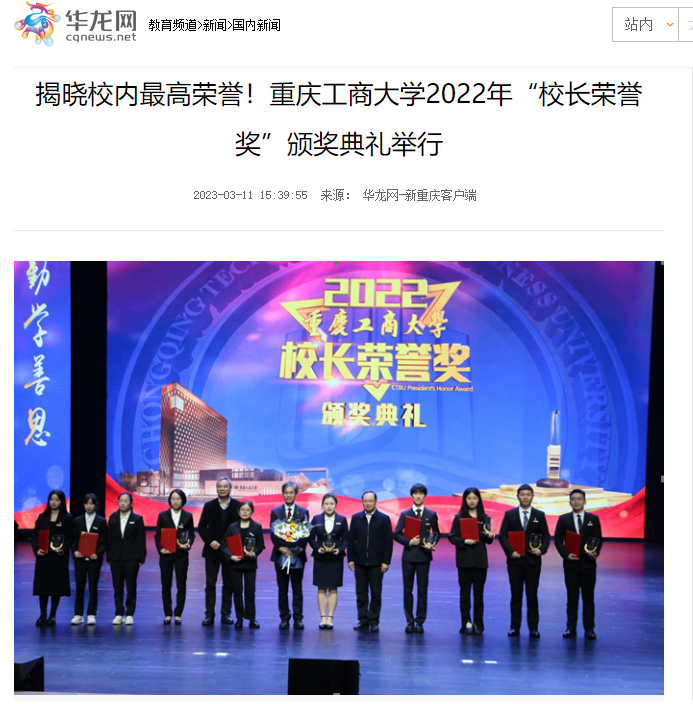 3月10日下午,学校在南岸校区剧场举行2022年“校长荣誉奖”颁奖典礼。人民网以《华体会体育·(sports)官方网站举行2022年“校长荣誉奖”颁奖典礼》为题,华龙网、网易新闻以《揭晓校内最高荣誉!华体会体育·(sports)官方网站2022年“校长荣誉奖”颁奖典礼举行》为题,对颁奖典礼进行广泛报道。