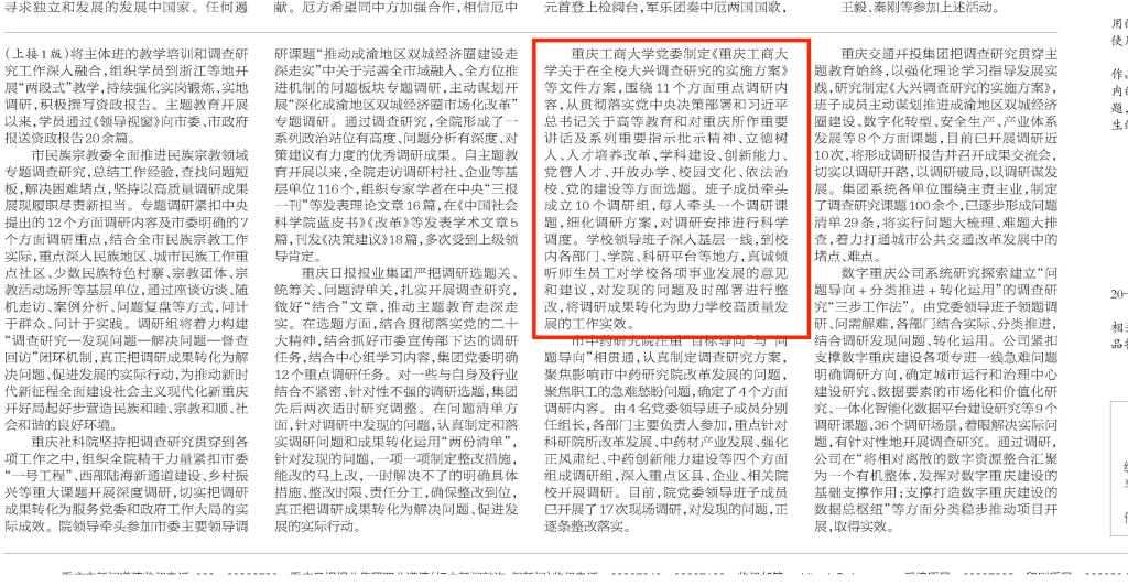 5月16日,重庆日报以《重庆第一批主题教育单位扎实开展调查研究》为题,报道我校扎实开展调查研究。报道中指出,学校党委制定《华体会体育·(sports)官方网站关于在全校大兴调查研究的实施方案》等文件方案,围绕11个方面重点调研内容,从贯彻落实党中央决策部署和习近平总书记关于高等教育和对重庆所作重要讲话及系列重要指示批示精神、立德树人、人才培养改革、学科建设、创新能力、党管人才、开放办学、校园文化、依法治校、党的建设等方面选题。班子成员牵头成立10个调研组,每人牵头一个调研课题,细化调研方案,对调研安排进行科学调度。学校领导班子深入基层一线,到校内各部门、学院、科研平台等地方,真诚倾听师生员工对学校各项事业发展的意见和建议,对发现的问题及时部署进行整改,将调研成果转化为助力学校高质量发展的工作实效。